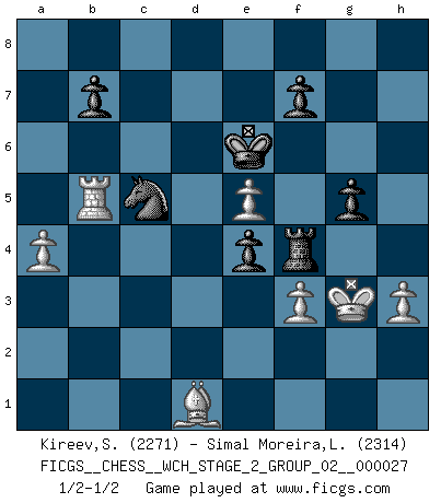 Last move : 1/2-1/2 2024 December 1 21:0:28 [Event "FICGS__CHESS__WCH_STAGE_2_GROUP_02__000027"] [Site "FICGS"] [Date "2024.10.01"] [Round "1"] [White "Kireev,Sergey"] [Black "Simal Moreira,Leonardo"] [Result "1/2-1/2"] [WhiteElo "2271"] [BlackElo "2314"] 1.c4 e5 2.g3 Nf6 3.Bg2 c6 4.Nf3 e4 5.Nd4 Qb6 6.e3 d5 7.Nc3 Bg4 8.Qb3 Bc5 9.h3 Bd7 10.Qxb6 Bxb6 11.b3 O-O 12.O-O Re8 13.Ba3 Na6 14.Rfd1 Nc5 15.cxd5 cxd5 16.Bf1 Nd3 17.Ncb5 h5 18.Kg2 h4 19.gxh4 a6 20.Nd6 Bxd4 21.exd4 Nf4+ 22.Kh2 Reb8 23.Rac1 a5 24.Nb5 Bxb5 25.Bxb5 Ne6 26.Bd6 Rc8 27.Be5 Kf8 28.d3 Rxc1 29.Rxc1 Ke7 30.a4 Rh8 31.b4 axb4 32.Rb1 Rxh4 33.Rxb4 g5 34.dxe4 Ng4+ 35.Kg3 Nxe5 36.dxe5 Nc5 37.f3 Rf4 38.Be2 dxe4 39.Bd1 Ke6 40.Rb5 1/2-1/2 Follow this game move after move (download)Fischer wanted to give the Russians a taste of their own medicine. (Larry Evans) Ich las kürzlich ein Buch von Nietzsche. Er sagte Religion verdumme nur die Menschen. Ich stimme zu. (Robert James Fischer) Combinaciones deslumbrantes son para la mayoría, mover madera es para los pocos. (Georg Kieninger) L'attaque fait le spectacle, la défense gagne les matchs. (Dicton footballistique) History is a gallery of pictures in which there are few originals and many copies. (Alexis de Tocqueville)