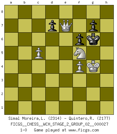 Last move : 1-0 2025 January 4 1:19:47 [Event "FICGS__CHESS__WCH_STAGE_2_GROUP_02__000027"] [Site "FICGS"] [Date "2024.10.01"] [Round "1"] [White "Simal Moreira,Leonardo"] [Black "Quintero,Raul"] [Result "1-0"] [WhiteElo "2314"] [BlackElo "2177"] 1.d4 Nf6 2.Bg5 Ne4 3.Bf4 c5 4.f3 Qa5+ 5.c3 Nf6 6.d5 Qb6 7.b3 e6 8.e4 exd5 9.exd5 Bd6 10.Bg5 Be7 11.c4 Qc7 12.Ne2 Qe5 13.Bc1 Qxa1 14.Nec3 b5 15.cxb5 a6 16.b6 O-O 17.d6 Bd8 18.Qd2 Nd5 19.Qxd5 Bf6 20.Qd2 Nc6 21.Kf2 Bd4+ 22.Kg3 Re8 23.Bb2 Be5+ 24.f4 Qxb2 25.Qxb2 Bd4 26.h3 Bb7 27.Bc4 Re3+ 28.Kh2 Ne5 29.Rd1 Nxc4 30.bxc4 Rae8 31.Rxd4 cxd4 32.Nd5 Re1 33.Ne7+ Kf8 34.c5 d3 35.Nc3 R8xe7 36.dxe7+ Rxe7 37.Qd2 f6 38.Qxd3 Bc6 39.Qxa6 Re3 40.b7 Re8 41.Nd5 Rb8 42.Nb4 Rxb7 43.Nxc6 Rc7 44.Nd4 Kf7 45.Qd6 Ra7 46.Nf5 Kg6 47.g4 Rxa2+ 48.Kg3 Ra3+ 49.Kh4 h5 50.Qe7 Rxh3+ 51.Kxh3 hxg4+ 52.Kxg4 1-0 Follow this game move after move (download)Chess problems demand from the composer the same virtues that characterize all worthwhile art: originality, invention, conciseness, harmony, complexity, and splendid insincerity. (Vladimir Nabokov) Der Partner hat auch seine Existenzberechtigung. (Savielly Grigorievitsch Tartakower) En partidas rápidas, el Caballo es mas poderoso que el Alfil. (Vlastimil Hort) Votre seul travail dans les ouvertures est d'obtenir un milieu de partie jouable. (Lajos Portish) It's not the will to win, but the will to prepare to win that makes the difference. (Bear Bryant)