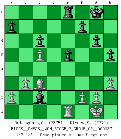Last move : 1/2-1/2 2024 November 30 13:34:10 [Event "FICGS__CHESS__WCH_STAGE_2_GROUP_02__000027"] [Site "FICGS"] [Date "2024.10.01"] [Round "1"] [White "Duttagupta,Aniruddha"] [Black "Kireev,Sergey"] [Result "1/2-1/2"] [WhiteElo "2275"] [BlackElo "2271"] 1.Nf3 Nf6 2.b3 c5 3.Bb2 Nc6 4.e3 g6 5.d4 cxd4 6.Nxd4 Bg7 7.c4 O-O 8.Be2 Qa5+ 9.Bc3 Qc7 10.O-O d5 11.Na3 Rd8 12.Nab5 Qb6 13.Nxc6 bxc6 14.c5 Qb7 15.Ba5 Rd7 16.Nc3 h5 17.Qc2 d4 18.Nd1 Rd5 19.Bc4 Bf5 20.Qc1 Qb8 21.Bxd5 Nxd5 22.Qd2 dxe3 23.Nxe3 Nxe3 24.Qxe3 Bxa1 25.Rxa1 Qb5 26.Bc3 Qd3 27.Qe1 Re8 28.h3 Qe4 29.Qd2 Qc2 30.Qe3 e5 31.Re1 Qd3 32.Qc1 Qc2 33.Qxc2 Bxc2 1/2-1/2 Follow this game move after move (download)Chess is a terrific way for kids to build self image and self esteem. (Saudin Robovic) Der vorletzte Fehler gewinnt. (Savielly Grigorievitsch Tartakower) Yo creo que el Ajedrez posee una magia que es también una ayuda en la edad avanzada. Una rodilla reumática es olvidada durante una partida de Ajedrez y otros eventos pueden parecer algo sin importancia comparada a una catástrofe en el tablero de Ajedrez. (Vlastimil Hort) Le temps de noter son nom sur la feuille de partie, j'étais déjà en zeitnot ! D'un modeste amateur apparié lors de la première ronde d'un open contre le grand-maître Azmaïparashvili. Methinks King Thibault should dub Marius Zubac a knight of the square board... I mean table, henceforth addressing him as Sir Marius, and bestow on him a suitable land from the kingdom of FICGS & marry him off to a worthy, fair maiden, lest he slice our heads with his mighty sword in his wrath. (Dinesh De Silva)