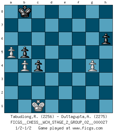 Last move : 1/2-1/2 2025 January 18 2:29:29 [Event "FICGS__CHESS__WCH_STAGE_2_GROUP_02__000027"] [Site "FICGS"] [Date "2024.10.01"] [Round "1"] [White "Tabudlong,Ronnie"] [Black "Duttagupta,Aniruddha"] [Result "1/2-1/2"] [WhiteElo "2256"] [BlackElo "2275"] 1.d4 Nf6 2.c4 e6 3.Nf3 d5 4.g3 Bb4+ 5.Bd2 Be7 6.Bg2 O-O 7.Qc2 c6 8.O-O b6 9.Nc3 Bb7 10.Rfd1 Nbd7 11.b3 Ba6 12.Bf4 Nh5 13.Bc1 Nhf6 14.Bf4 Rc8 15.e4 dxc4 16.Nd2 Nh5 17.Be3 Nhf6 18.Nxc4 b5 19.Nb2 Ng4 20.Bf4 c5 21.d5 g5 22.Bc1 c4 23.Qe2 Nde5 24.h3 Qa5 25.hxg4 Qxc3 26.Be3 Qb4 27.f4 gxf4 28.gxf4 Ng6 29.d6 Bxd6 30.a3 Nxf4 31.Bxf4 Qc5+ 32.Be3 Qe5 33.b4 Bb7 34.Qf2 Qh2+ 35.Kf1 f5 36.exf5 Bg3 37.Qg1 Bxg2+ 38.Qxg2 Qh4 39.Rd4 Be5 40.Bf2 Qg5 41.Qe4 Qf6 42.Rd7 Bxb2 43.Re1 Rcd8 44.Rxd8 Rxd8 45.fxe6 Bd4 46.Re2 Bb6 47.e7 Re8 48.Qd5+ Qf7 49.Qg5+ Kh8 50.Qe5+ Kg8 51.Qg5+ Kh8 52.Qe5+ Kg8 53.Qxb5 Rxe7 54.Qg5+ Kf8 55.Qxe7+ Qxe7 56.Rxe7 Kxe7 57.Bxb6 axb6 58.a4 Kd7 59.Ke1 Kc6 60.Kd2 b5 61.a5 h6 62.Kc2 Kc7 63.Kc1 Kb8 1/2-1/2 Follow this game move after move (download)If one piece is badly posted, the whole game is bad. (Tarrasch) Früher wurde jeder komplizierte Zug, jedes interessante Opfer mit großem Beifall und Enthusiasmus aufgenommen. Heute schaltet man einfach seinen Fritz an, und man kann sehen, was los ist, ob der Zug geht oder nicht. (Vladimir Kramnik) Las leyes del Ajedrez no permiten una libre elección: tienes que mover quieras o no. (Emanuel Lasker) C'est la seule position que je connaisse où les deux camps sont mals. Propos prêtés à V. Anand. To steal ideas from one person is plagiarism. To steal from many is research. (Unknown)
