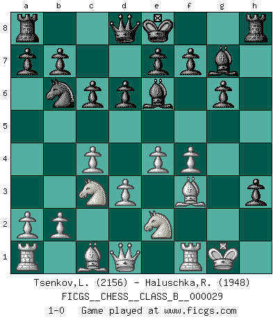 Last move : 1-0 2007 December 21 21:33:58 [Event "FICGS__CHESS__CLASS_B__000029"] [Site "FICGS"] [Date "2007.09.20"] [Round "1"] [White "Tsenkov,Ljubomir"] [Black "Haluschka,Rainer"] [Result "1-0"] [WhiteElo "2156"] [BlackElo "1948"] 1.c4 g6 2.Nc3 Bg7 3.g3 c6 4.Bg2 Nf6 5.e4 d6 6.Nge2 Nbd7 7.O-O h5 8.h3 Nb6 9.d3 h4 10.g4 Nxg4 11.hxg4 Bxg4 12.f3 Be6 13.f4 h3 14.Bf3 1-0 This chess game has been lost on time (started : 2007.09.20 15:28:55) English Opening Kingside Castling by player White (move 7) Player White won this chess game. Follow this game move after move (download)Chess is the gymnasium of the mind. (Blaise Pascal) Im Schach gibt es keinen Platz für Galanterie. (Irving Chernev) Una buena ofensiva y una buena defensa, comienzan ambas con un buen desarrollo. (Bruce A. Moon) La solitude du joueur d'Echecs à l'approche du mat est semblable à celle du condamné. (Francis Szpiner) Plans are ideas that never come to fruition. (Daniel Parmet)
