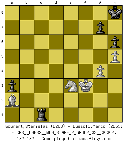 Last move : 1/2-1/2 2024 November 21 21:21:33 [Event "FICGS__CHESS__WCH_STAGE_2_GROUP_03__000027"] [Site "FICGS"] [Date "2024.10.01"] [Round "1"] [White "Gounant,Stanislas"] [Black "Bussoli,Marco"] [Result "1/2-1/2"] [WhiteElo "2288"] [BlackElo "2269"] 1.b3 d5 2.Bb2 Bf5 3.Nf3 e6 4.g3 Nf6 5.Bg2 h6 6.O-O c6 7.d3 Be7 8.Nbd2 O-O 9.Re1 Bh7 10.e4 Qb6 11.Qe2 a5 12.a3 Rd8 13.Bd4 Qa6 14.Bb2 Nbd7 15.exd5 cxd5 16.a4 Bb4 17.Nd4 Rac8 18.Rac1 Bg6 19.Nb5 Bh5 20.f3 Ne8 21.c3 Bf8 22.d4 Nc7 23.c4 dxc4 24.bxc4 e5 25.g4 Bg6 26.f4 exf4 27.c5 Re8 28.Qf1 Rxe1 29.Rxe1 Qf6 30.Ba1 Qd8 31.Qxf4 Nxc5 32.dxc5 Ne6 33.Rxe6 fxe6 34.Bd4 Bxc5 35.Bxb7 Bxd4+ 36.Nxd4 Rc1+ 37.Kf2 Qb6 38.Bf3 Rc3 39.Kg2 Rd3 40.Ne2 e5 41.Nc4 exf4 42.Nxb6 Bf7 43.Nxf4 Rd4 44.Nfd5 Kh8 45.Kf2 Bxd5 46.Bxd5 Rb4 47.Nc4 Rxa4 48.h4 Rb4 49.h5 Rb5 50.Bf7 a4 51.Na3 Rb4 52.Bc4 Rb2+ 53.Ke3 Rg2 54.Kf3 Rg1 55.Nc2 Rc1 56.Ne3 a3 57.Ba2 1/2-1/2 Follow this game move after move (download)Every Pawn is a potential Queen. (James Mason) Schon mancher Spieler hat aufgegeben, um zu vermeiden, daß er eine Figur verliert. (Savielly Grigorievitsch Tartakower) El jugador táctico sabe que hacer cuando hay algo que hacer; mientras que el estratega sabe que hacer cuando no hay nada que hacer. (Gerald Abrahams) 'L'échange des dames est un coup dur pour les deux adversaires...' Un journaliste lors d'une partie du match Spassky-Fischer Always remember that you are unique; just like everyone else. (Unknown)