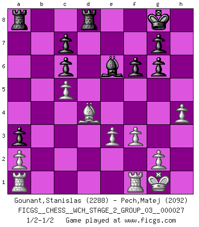 Last move : 1/2-1/2 2024 December 1 23:46:34 [Event "FICGS__CHESS__WCH_STAGE_2_GROUP_03__000027"] [Site "FICGS"] [Date "2024.10.01"] [Round "1"] [White "Gounant,Stanislas"] [Black "Pech,Matej"] [Result "1/2-1/2"] [WhiteElo "2288"] [BlackElo "2092"] 1.b3 e5 2.Bb2 Nc6 3.e3 Nf6 4.Bb5 Bd6 5.Na3 e4 6.Nc4 Be7 7.Bxc6 bxc6 8.Ne2 O-O 9.O-O a5 10.d3 a4 11.Rc1 d5 12.Ne5 Qe8 13.dxe4 Nxe4 14.Nd3 Bd6 15.c4 a3 16.Ba1 dxc4 17.bxc4 Qe7 18.Qc2 Nc5 19.Nxc5 Bxc5 20.Nd4 Bxd4 21.Bxd4 Rd8 22.c5 f6 23.f3 Qf7 24.Rb1 Be6 25.Ra1 Qg6 26.Qxg6 hxg6 27.h4 1/2-1/2 Follow this game move after move (download)You may learn much more from a game you lose than from a game you win. You will have to lose hundreds of games before becoming a good player. (Jose Raul Capablanca) Wenn du gegen Bobby spielst, ist es keine Frage von gewinnen oder verlieren. Es ist eine Frage des Überlebens. (Boris Vassilievich Spassky) En posiciones complicadas, Bobby Fischer pocas veces tuvo que temer de cualquiera. (Paul Keres) Vous savez, camarade Pachman, je n'éprouve pas de plaisir à être ministre, je jouerais plutôt aux échecs comme vous, ou alors ferais une révolution au Venezuela. (Che Guevara à Ludek Pachman, 'Checkmate in Prague', 1975) Perseverance does not equal worthiness. Next time you want to get my attention, wear something fun. Low-riding jeans are hot. (Gregory House, House M.D.)