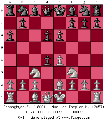 Last move : 0-1 2007 November 4 12:32:4 [Event "FICGS__CHESS__CLASS_B__000029"] [Site "FICGS"] [Date "2007.09.20"] [Round "1"] [White "Dabbaghyan,Edwin"] [Black "Mueller-Toepler,Michael"] [Result "0-1"] [WhiteElo "1800"] [BlackElo "2057"] 1.e4 c5 2.Nf3 e6 3.Nc3 a6 4.Be2 d6 5.d4 cxd4 0-1 This chess game has been lost on time (started : 2007.09.20 15:28:55) Sicilian defense Player Black won this chess game. Follow this game move after move (download)It was clear to me that the vulnerable point of the American Grandmaster (Bobby Fischer) was in double-edged, hanging, irrational positions, where he often failed to find a win even in a won position. (Efim Geller) Wenn Dein Gegner dir ein Remis anbietet, versuch herauszufinden, weshalb er glaubt schlechter zu stehen. (Nigel Short) El sobresalir en el Ajedrez es un signo de una mente intrigante. (Sir Arthur Conan Doyle) Ce qui est bien, c'est d'avoir tout un tas de pièces en prise : l'adversaire ne peut en prendre qu'une à la fois. Cité par Thierry Audin. The bottom line is always the bottom line. (Johann Piek)