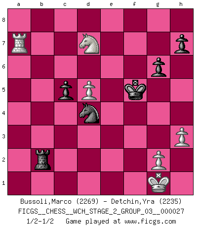 Last move : 1/2-1/2 2024 November 15 0:27:57 [Event "FICGS__CHESS__WCH_STAGE_2_GROUP_03__000027"] [Site "FICGS"] [Date "2024.10.01"] [Round "1"] [White "Bussoli,Marco"] [Black "Detchin,Yra"] [Result "1/2-1/2"] [WhiteElo "2269"] [BlackElo "2235"] 1.d4 Nf6 2.c4 g6 3.Nc3 Bg7 4.e4 d6 5.Be2 O-O 6.Be3 c5 7.d5 e6 8.Nf3 exd5 9.cxd5 Bg4 10.Nd2 Bxe2 11.Qxe2 Re8 12.f3 Nfd7 13.O-O Na6 14.Rae1 Nc7 15.Kh1 Qe7 16.h3 a6 17.Nc4 Nb5 18.Bf4 Ne5 19.Nb6 Nd4 20.Qd1 Rab8 21.a4 Nd7 22.Nc4 Ne5 23.Bxe5 Bxe5 24.f4 b5 25.axb5 axb5 26.Nxb5 Rxb5 27.fxe5 dxe5 28.Rf2 Rf8 29.Kh2 Kg7 30.Kg1 Rb4 31.Qd3 Rb3 32.Qd1 Qh4 33.Qg4 Qe7 34.Qd1 Qg5 35.Qc1 Qxc1 36.Rxc1 f5 37.Ra1 Rfb8 38.Nxe5 Rxb2 39.Rxb2 Rxb2 40.Ra7+ Kf6 41.Nd7+ Kg5 42.exf5 Kxf5 1/2-1/2 Follow this game move after move (download)No price is too great for the scalp of the enemy King. (Koblentz) Jeder weiß, dass Gasprom Putins persönliches Machtinstrument ist. Die Firma wird vom Kreml aus geleitet und wird schon deshalb nie transparent sein. (Garry Kasparov) Mi estilo es algo parecido entre un poco de Tal y Petrosian. (Reshevsky) Je menace de comprendre la position. (Anonyme) Over-the-board chess is the favorite of mortals, correspondence chess is the favorite of the gods. (Eduard Dyckhoff)
