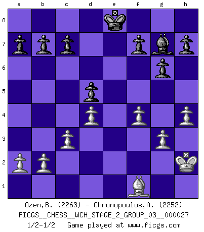 Last move : 1/2-1/2 2024 October 28 14:55:36 [Event "FICGS__CHESS__WCH_STAGE_2_GROUP_03__000027"] [Site "FICGS"] [Date "2024.10.01"] [Round "1"] [White "Ozen,Bahadir"] [Black "Chronopoulos,Antonis"] [Result "1/2-1/2"] [WhiteElo "2263"] [BlackElo "2252"] 1.e4 e5 2.Nf3 Nc6 3.Bb5 Nf6 4.O-O Nxe4 5.Re1 Nd6 6.Nxe5 Be7 7.Bf1 Nxe5 8.Rxe5 O-O 9.d4 Bf6 10.Re1 Re8 11.c3 Rxe1 12.Qxe1 Ne8 13.Bf4 d5 14.Nd2 Nd6 15.Qe3 Bf5 16.Qg3 Bh4 17.Qf3 Bg5 18.Bxd6 Qxd6 19.Qxf5 Bxd2 20.h4 g6 21.Qd3 Bh6 22.g3 Bg7 23.Re1 Qd7 24.Qe3 Kf8 25.Kh2 Re8 26.Qxe8+ Qxe8 27.Rxe8+ Kxe8 28.f4 1/2-1/2 Follow this game move after move (download)Human affairs are like a Chess game: only those who do not take it seriously can be called good players. (Hung Tzu Ch'eng) Der vorletzte Fehler gewinnt. (Savielly Grigorievitsch Tartakower) No soy una persona materialista y por eso, no resiento la falta o pérdida del dinero. La ausencia de cosas mundanas carece de importancia. Ya que el Ajedrez es una forma en la que puedo ser tan materialista como yo desee sin tener la necesidad de vender mi alma. (Jamie Walter Adams) Le joueur d'Echecs qui veut atteindre le top est obligé de développer son propre credo créatif. Alexeï Stepanovicth Souétine. Il est facile d'écrire des livres ! Ce qui est difficile, c'est de jouer ! (Alexeï Stepanovicth Souétine) I live to kill Traxler counterattack. (Ilmars Cirulis)