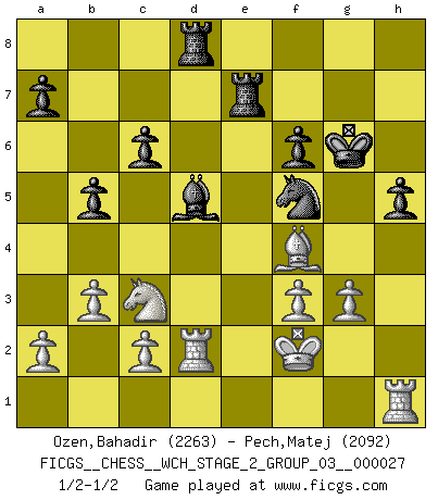 Last move : 1/2-1/2 2024 November 30 13:29:3 [Event "FICGS__CHESS__WCH_STAGE_2_GROUP_03__000027"] [Site "FICGS"] [Date "2024.10.01"] [Round "1"] [White "Ozen,Bahadir"] [Black "Pech,Matej"] [Result "1/2-1/2"] [WhiteElo "2263"] [BlackElo "2092"] 1.e4 e5 2.Nf3 Nc6 3.Bb5 Nf6 4.O-O Nxe4 5.d4 Nd6 6.Bxc6 dxc6 7.dxe5 Nf5 8.Qxd8+ Kxd8 9.Nc3 Ke8 10.h3 h5 11.Bf4 Be7 12.Rad1 Be6 13.Ng5 Rh6 14.g3 Bxg5 15.Bxg5 Rg6 16.h4 f6 17.exf6 gxf6 18.Bf4 Nxh4 19.f3 Rg7 20.Ne4 Kf7 21.Kf2 Nf5 22.Bxc7 Bd5 23.Nc3 Kg6 24.Bf4 Rd8 25.Rh1 Re7 26.b3 b5 27.Rd2 1/2-1/2 Follow this game move after move (download)A man that will take back a move at Chess will pick a pocket. (Richard Fenton) Die Leute spielen gegen mich seit 15 Jahren unter Ihren Möglichkeiten. (Robert James Fischer) Si no le temes a Spassky, entonces elimino el elemento del dinero. (Jim Slater) Echiquier : carré parfait, comme la Jérusalem nouvelle décrite par l'auteur de l'Apocalypse, huit cases sur huit, exaltation du chiffre 4, symbole du cosmos aux quatre horizons... où le noir et le blanc, l'ombre et la lumière, le mal et le bien s'entremêlent et se conjuguent. (Robert Couffignal, Le Gambit du poète) History is the quarrels of popes and kings, with wars or pestilences in every page; the men all so good for nothing, and hardly any women at all. (Jane Austen)