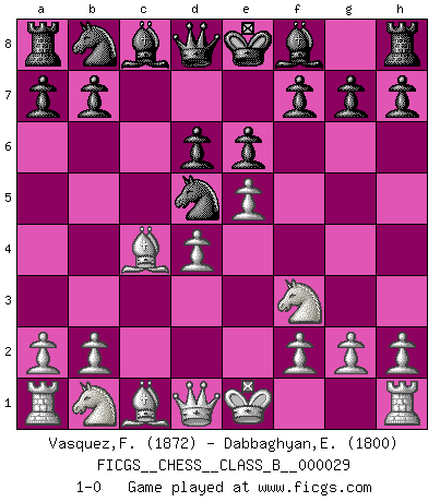 Last move : 1-0 2007 November 16 7:19:10 [Event "FICGS__CHESS__CLASS_B__000029"] [Site "FICGS"] [Date "2007.09.20"] [Round "1"] [White "Vasquez,Fernando"] [Black "Dabbaghyan,Edwin"] [Result "1-0"] [WhiteElo "1872"] [BlackElo "1800"] 1.e4 c5 2.d4 cxd4 3.c3 Nf6 4.e5 Nd5 5.Nf3 e6 6.cxd4 d6 7.Bc4 1-0 This chess game has been lost on time (started : 2007.09.20 15:28:55) Sicilian : Smith-Morra gambit Player White won this chess game. Follow this game move after move (download)Every Pawn is a potential Queen. (James Mason) Der Traum, für den ich lebe, ist der von einem freien Russland. Viele mögen sagen: Russland hat doch ein Parlament, einen gewählten Präsidenten. Aber ich spüre, dass in meiner Heimat die Angst wiederkehrt. Eine Angst, sich frei zu äußern, bestimmte Dinge zu tun (Garry Kasparov) Es el objetivo de la escuela moderna no tratar cada posición de acuerdo a una regla general, sino de acuerdo al principio inherente en la posición. (Richard Reti) Les Echecs sont et restent toujours un combat, un combat intégral comme la boxe, la lutte ou un autre sport, et où il doit y avoir un vainqueur et un vaincu. (Joseph Emil Diemer) Success without honor is an unseasoned dish; it will satisfy your hunger, but it won't taste good. (Joe Paterno)