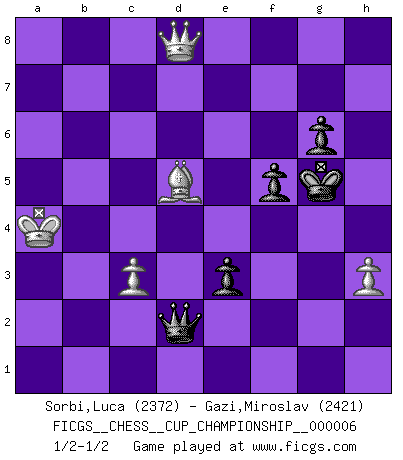Last move : 1/2-1/2 2024 December 15 18:26:55 [Event "FICGS__CHESS__CUP_CHAMPIONSHIP__000006"] [Site "FICGS"] [Date "2024.10.06"] [Round "1"] [White "Sorbi,Luca"] [Black "Gazi,Miroslav"] [Result "1/2-1/2"] [WhiteElo "2372"] [BlackElo "2421"] 1.e4 c5 2.Nf3 d6 3.d4 cxd4 4.Nxd4 Nf6 5.Nc3 a6 6.Be3 e5 7.Nb3 Be6 8.f3 h5 9.Qd2 Nbd7 10.Nd5 Bxd5 11.exd5 g6 12.O-O-O Nb6 13.Kb1 Nfxd5 14.Bg5 Be7 15.Bxe7 Qxe7 16.Qa5 Ne3 17.Qxb6 Nxd1 18.Bc4 Nxb2 19.Kxb2 Rc8 20.Nd2 O-O 21.Bb3 Rc6 22.Qe3 Rfc8 23.Rc1 Kg7 24.g4 hxg4 25.fxg4 a5 26.c3 Qd7 27.h3 R6c7 28.Qe4 Qc6 29.a4 Rh8 30.Qd3 Rb8 31.Bd5 Qxa4 32.Rf1 Ra8 33.Bb3 Qc6 34.Bd5 Qa4 35.Bb3 Qc6 36.Ne4 Ra6 37.Rf6 a4 38.Rxd6 Qe8 39.Bd5 Rxd6 40.Nxd6 Qf8 41.Bc4 Rc6 42.Ne4 Qe7 43.g5 Rc8 44.Qf1 Rh8 45.Bd5 Rh4 46.Ka2 Rxe4 47.Bxe4 Qxg5 48.Qd3 f5 49.Bxb7 Qc1 50.Qc4 e4 51.Bc6 Qd2+ 52.Ka3 Kf6 53.Kxa4 Ke5 54.Qc5+ Kf4 55.Bd5 e3 56.Qc7+ Kg5 57.Qd8+ 1/2-1/2 Follow this game move after move (download)Suddenly it was obvious to me in my analysis I had missed what Fischer had found with the greatest of ease at the board. (Mikhail Botvinnik) Der Knackpunkt bei der Konzentration ist, daß wir nur durch sie etwas Neues und Ungewöhnliches am Schachbrett finden können. Sie ist der einzige Weg durch neue neue Ideen eine Überraschung zu bereiten. (Garry Kasparov) EL Ajedrez es como la vida. (Boris Spassky) Seul un grand joueur sait à quel point il joue faiblement. (Xavier Tartacover) He who is a good ruler must first have been ruled. (Aristotle)