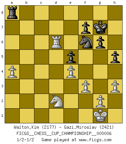 Last move : 1/2-1/2 2024 December 8 22:17:28 [Event "FICGS__CHESS__CUP_CHAMPIONSHIP__000006"] [Site "FICGS"] [Date "2024.10.06"] [Round "1"] [White "Walton,Kim"] [Black "Gazi,Miroslav"] [Result "1/2-1/2"] [WhiteElo "2177"] [BlackElo "2421"] 1.e4 c5 2.Nf3 d6 3.Bb5+ Nd7 4.d4 cxd4 5.Qxd4 a6 6.Be2 Ngf6 7.O-O e5 8.Qe3 Nc5 9.Nfd2 Be7 10.c4 O-O 11.Nc3 Ng4 12.Bxg4 Bxg4 13.Nb3 Nd7 14.Qd3 Be6 15.Be3 Rc8 16.Nd2 g6 17.Nd5 Bg5 18.Rac1 Bxe3 19.Qxe3 Kg7 20.b3 b5 21.h3 Re8 22.a3 h5 23.cxb5 axb5 24.Qd3 Bxd5 25.Qxd5 Qb6 26.a4 Rxc1 27.Rxc1 bxa4 28.Rc6 Qb4 29.Qxd6 Qxd6 30.Rxd6 Ra8 31.bxa4 Nf6 32.f3 1/2-1/2 Follow this game move after move (download)A bad plan is better than none at all. (Frank Marshall) Gegen einen Schachcomputer zu verlieren ist wie Löcher in den Strümpfen zuhaben. Es ist nicht peinlich, solange man der einzige ist der es weiß. (Anonymous) Es muy difÃcil jugar en contra de la teorÃa de Einstein. - en su primera derrota en contra de Fischer (Mikhail Tal) Les échecs sont plus proches de l'art de l'assassinat que de l'art de la guerre. (Arturo Perez-Reverte) Empty your mind, be formless, shapeless — like water. (Bruce Lee)