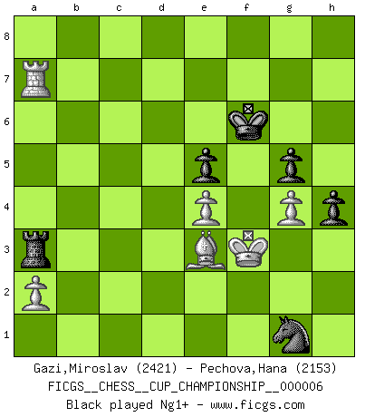 Last move : 1/2-1/2 2025 May 3 10:45:47 [Event "FICGS__CHESS__CUP_CHAMPIONSHIP__000006"] [Site "FICGS"] [Date "2024.10.06"] [Round "1"] [White "Gazi,Miroslav"] [Black "Pechova,Hana"] [Result "1/2-1/2"] [WhiteElo "2421"] [BlackElo "2153"] 1.Nf3 Nf6 2.c4 c5 3.Nc3 Nc6 4.d4 cxd4 5.Nxd4 e6 6.g3 Qb6 7.e3 Bb4 8.Bg2 Ne5 9.O-O Bxc3 10.bxc3 Nxc4 11.Qe2 Qc5 12.Nb3 Qc7 13.Nd2 d5 14.Nxc4 Qxc4 15.Qxc4 dxc4 16.Rd1 O-O 17.Ba3 Re8 18.Rd4 e5 19.Rxc4 e4 20.Bc5 Be6 21.Ra4 a5 22.Bf1 Bd7 23.Rd4 Rac8 24.Bb6 Rxc3 25.Bxa5 Rc2 26.Bc4 Be6 27.Bxe6 fxe6 28.Be1 h5 29.Rb4 Rf8 30.h3 Nh7 31.Rxb7 Ng5 32.Kg2 Nf3 33.Bb4 Rfc8 34.Ba3 Re2 35.Rb2 Ne1+ 36.Kf1 Rxb2 37.Bxb2 Nd3 38.Bd4 e5 39.Bb6 Rb8 40.Ba5 Ra8 41.Bd2 Ra3 42.Ke2 Kf7 43.f3 exf3+ 44.Kxf3 g5 45.Ke4 Ke6 46.Kf3 Kd7 47.g4 h4 48.Ke4 Ke6 49.Kf3 Kd5 50.e4+ Ke6 51.Be3 Nf4 52.Rb1 Nxh3 53.Rb6+ Kf7 54.Rb7+ Kf6 55.Ra7 Ng1+ 1/2-1/2 Follow this game move after move (download)There are tough players and nice guys, and I'm a tough player. (Bobby Fischer) Nicht daß Diemer aus Opportunismus Mitglied der NSDAP geworden wäre. Er war ein Fanatiker, in allem, was er tat. (Hans Ree) Buenas posiciones no logran ganar juegos, buenas movidas sí. (Gerald Abrahams) On entre au jeu d'Echecs comme on entre en Religion. Pour le joueur d'Echecs, la partie d'Echecs c'est l'office, la messe, le défilé du 1er Mai, le dépôt de gerbe au Monument aux Morts. C'est un drame sacré. (Michel Roos) They say in chess you've got to kill the queen, and then you mate it... Oh I, do you ? (Red Hot Chili Peppers, Fortune faded)