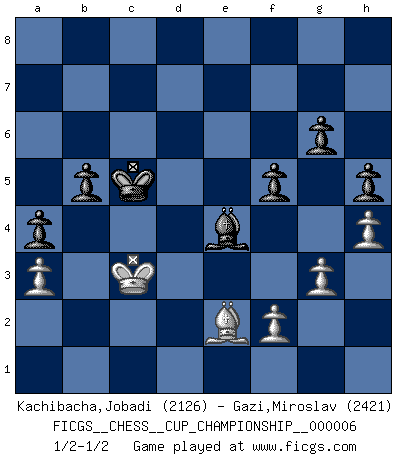 Last move : 1/2-1/2 2025 March 9 10:40:44 [Event "FICGS__CHESS__CUP_CHAMPIONSHIP__000006"] [Site "FICGS"] [Date "2024.10.06"] [Round "1"] [White "Kachibacha,Jobadi"] [Black "Gazi,Miroslav"] [Result "1/2-1/2"] [WhiteElo "2126"] [BlackElo "2421"] 1.d4 Nf6 2.c4 g6 3.Nc3 d5 4.cxd5 Nxd5 5.e4 Nxc3 6.bxc3 Bg7 7.Nf3 c5 8.Be3 Qa5 9.Qd2 Nc6 10.Rc1 cxd4 11.cxd4 Qxd2+ 12.Kxd2 O-O 13.d5 Rd8 14.Ke1 Na5 15.Bg5 Bd7 16.Bd3 f5 17.e5 Be8 18.d6 Rdc8 19.dxe7 h6 20.Be3 Rxc1+ 21.Bxc1 Nc6 22.Ba3 Nxe5 23.Nxe5 Bxe5 24.h4 h5 25.Bc4+ Kg7 26.Rh3 Bf6 27.Rb3 Bc6 28.g3 Re8 29.Re3 b5 30.Bb3 a5 31.Bd6 a4 32.Bc2 Kf7 33.Kd2 Bxe7 34.Rxe7+ Rxe7 35.Bxe7 Kxe7 36.a3 Kd6 37.Kc3 Kc5 38.Bd3 Bf3 39.Bf1 Bd5 40.Be2 Bc4 41.Bd1 Bd5 42.Be2 Bb3 43.Bf3 Be6 44.Be2 Bd5 45.Bf1 Bf3 46.Bd3 Be4 47.Be2 1/2-1/2 Follow this game move after move (download)When your house is on fire, you can't be bothered with the neighbors. Or, as we say in Chess, if your King is under attack you don't worry about losing a Pawn on the Queen's side. (Gary Kasparov) Wenn du auf das Glück wartest, wird das Leben ziemlich langweilig. (Mikhail Nekhemyevich Tal) Los finales de Peón son del Ajedrez lo que el cesped es del Golf. (Cecil Purdy) Les échecs sont un jeu par leur forme, un art par leur essence et une science par sa difficulté d'acquisition. Ils peuvent vous procurer autant de plaisir qu'un bon livre ou une belle musique, mais vous n'aurez une réelle joie que si vous arrivez à bien jouer. (Tigran Petrosian) Tree pose grows confidence. It roots me to this world. (Terri Guillemets)