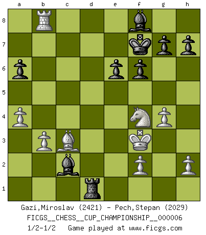 Last move : 1/2-1/2 2025 March 19 14:30:15 [Event "FICGS__CHESS__CUP_CHAMPIONSHIP__000006"] [Site "FICGS"] [Date "2024.10.06"] [Round "1"] [White "Gazi,Miroslav"] [Black "Pech,Stepan"] [Result "1/2-1/2"] [WhiteElo "2421"] [BlackElo "2029"] 1.Nf3 Nf6 2.c4 c5 3.Nc3 Nc6 4.d4 cxd4 5.Nxd4 e6 6.g3 Qb6 7.e3 Bb4 8.Bg2 Ne5 9.O-O Nxc4 10.Na4 Qa5 11.b3 Na3 12.Bb2 O-O 13.Ne2 Be7 14.e4 d5 15.exd5 Nxd5 16.Nac3 Nxc3 17.Bxc3 Qh5 18.Bb2 Rd8 19.Qe1 Qc5 20.Rd1 Bd7 21.Bxb7 Rab8 22.Bf3 Nc2 23.Qc3 Qxc3 24.Bxc3 Bb5 25.Be5 Rbc8 26.Rxd8+ Rxd8 27.Rc1 Nb4 28.Rc7 Rd1+ 29.Kg2 Bf8 30.Rb7 a6 31.a4 Bd3 32.Rb8 Nc2 33.g4 Ne1+ 34.Kg3 Nxf3 35.Kxf3 f6 36.Bc3 Kf7 37.Rb7+ Ke8 38.Rb8+ Kf7 39.Nf4 Bc2 40.Rb7+ Ke8 41.Rb8+ Kf7 42.Rb7+ Ke8 43.Rb8+ Kf7 1/2-1/2 Follow this game move after move (download)Bobby Fischer is the greatest Chess genius of all time ! (Alexander Kotov) Karpov ist ein Museumsstück. (Garry Kasparov) Solo el jugador con la iniciativa tiene el derecho a atacar. (Wilhelm Steinitz) Les Echecs, c'est l'art de la guerre sans les charniers, c'est la résurrection des morts tombés au champ d'honneur, l'espoir perpétuel, la suprématie de l'intelligence sur la force, la culture de l'esprit. (F. Szpiner) Rules and bones are meant to be broken. (Anonymous)