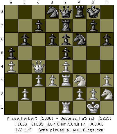 Last move : 1/2-1/2 2024 December 7 12:5:23 [Event "FICGS__CHESS__CUP_CHAMPIONSHIP__000006"] [Site "FICGS"] [Date "2024.10.06"] [Round "1"] [White "Kruse,Herbert"] [Black "DeBonis,Patrick"] [Result "1/2-1/2"] [WhiteElo "2396"] [BlackElo "2253"] 1.e4 e5 2.Nf3 Nc6 3.Bc4 Nf6 4.d3 Bc5 5.c3 d6 6.O-O O-O 7.h3 Bb6 8.Re1 h6 9.Nbd2 a5 10.a4 Be6 11.Bxe6 fxe6 12.Nc4 Bc5 13.Be3 Bxe3 14.Rxe3 b6 15.Qb3 Rf7 16.Ncd2 Qd7 17.Nh2 Raf8 18.Ndf3 Nb8 19.Rae1 Nh5 20.Qd1 Nf6 21.Qb3 Nc6 22.Nh4 Kh7 23.N4f3 Qe8 24.Qc2 Kg8 25.Qb3 Re7 26.Nf1 Ref7 27.N1h2 Re7 28.Qc4 Nd8 1/2-1/2 Follow this game move after move (download)The combination player thinks forward; he starts from the given position, and tries the forceful moves in his mind. (Emanuel Lasker) Es ist im Leben wie im Schachspiel. Wir entwerfen einen Plan, dieser bleibt jedoch bedingt durch das, was im Schachspiel dem Gegner, im Leben dem Schicksal zu tun belieben wird. (Arthur Schopenhauer) Tu sabes, camarada Pachman, no disfruto el ser un Ministro, preferería jugar al Ajedrez como tu. (Che Guevara) La vie est comme un jeu d'échecs : nous esquissons un plan, mais celui-ci est tributaire de ce que daignent faire l'adversaire aux échecs et le destin dans la vie. (Arthur Schopenhauer) A person who never made a mistake never tried anything new. (Albert Einstein)