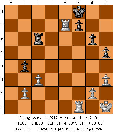Last move : 1/2-1/2 2024 December 12 19:56:40 [Event "FICGS__CHESS__CUP_CHAMPIONSHIP__000006"] [Site "FICGS"] [Date "2024.10.06"] [Round "1"] [White "Pirogov,Andrey Mikhaylovich"] [Black "Kruse,Herbert"] [Result "1/2-1/2"] [WhiteElo "2201"] [BlackElo "2396"] 1.e4 c5 2.Nf3 d6 3.d4 cxd4 4.Nxd4 Nf6 5.Nc3 a6 6.f3 e5 7.Nb3 Be6 8.Be3 h5 9.Qd2 Nbd7 10.Nd5 Bxd5 11.exd5 g6 12.Be2 Bg7 13.O-O b6 14.Kh1 O-O 15.a4 Re8 16.c3 Qc8 17.Rad1 Rb8 18.Bg5 Qb7 19.Qd3 Ra8 20.Nd2 e4 21.Nxe4 Nxe4 22.fxe4 Nc5 23.Qf3 Nxe4 24.Bf4 Qe7 25.Bd3 Nc5 26.Qg3 Nxd3 27.Qxd3 Qd7 28.Qc4 Bf8 29.h3 b5 30.Qc6 Qxc6 31.dxc6 Rac8 32.axb5 axb5 33.Bxd6 Rxc6 34.Bxf8 Kxf8 35.Rd5 b4 36.Rd7 Re7 37.Rxe7 1/2-1/2 Follow this game move after move (download)Those who say they understand Chess, understand nothing. (Robert Hubner) Ich habe Kasparov in Rente geschickt. (Veselin Topalov) Cuando la partida de Ajedrez termina, el Peón y el Rey regresan a la misma caja. (Irish saying) Aucun coup ne doit être joué sans but. (Pedro Damiano) It's not the will to win, but the will to prepare to win that makes the difference. (Bear Bryant)