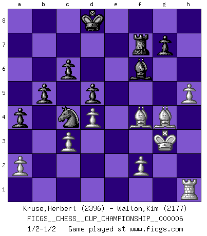 Last move : 1/2-1/2 2024 December 3 16:27:43 [Event "FICGS__CHESS__CUP_CHAMPIONSHIP__000006"] [Site "FICGS"] [Date "2024.10.06"] [Round "1"] [White "Kruse,Herbert"] [Black "Walton,Kim"] [Result "1/2-1/2"] [WhiteElo "2396"] [BlackElo "2177"] 1.e4 e5 2.Nf3 Nc6 3.Bc4 Bc5 4.c3 Nf6 5.d4 exd4 6.e5 d5 7.Bb5 Ne4 8.cxd4 Bb6 9.Nc3 O-O 10.Be3 Bg4 11.h3 Bh5 12.Qc2 Nxc3 13.bxc3 f6 14.exf6 Qxf6 15.Be2 Na5 16.O-O Bxf3 17.Bxf3 c6 18.Rae1 Nc4 19.Bc1 Qg6 20.Qxg6 hxg6 21.Re7 Rf7 22.Re2 Ba5 23.Rc2 Re8 24.Be2 Rfe7 25.Bg4 b5 26.g3 Kf7 27.h4 Bd8 28.Kg2 a5 29.Rh1 Rb7 30.Rh3 Bf6 31.Be2 Rbe7 32.Kf3 a4 33.g4 Re6 34.Bd3 Be7 35.Kg2 Rh8 36.h5 gxh5 37.gxh5 Re1 38.Re2 Rxe2 39.Bxe2 Bf6 40.Bg4 Ke7 41.Rh1 Kd8 42.Bf4 Rf8 43.Kg3 Rf7 44.Re1 Re7 45.Rh1 Rf7 46.Re1 Re7 47.Rh1 Rf7 1/2-1/2 Follow this game move after move (download)A win by an unsound combination, however showy, fills me with artistic horror. (Wilhelm Steinitz) Modernes Schach sorgt sich zuviel um Dinge wie Bauernstruktur usw. Vergessen Sie das, Schachmatt beendet das Spiel! (Nigel Short) Prefiero perder una partida realmente buena, que ganar una mala. (David Levy) Vous n'êtes pas toujours obligé de jouer le meilleur coup. Un coup doit être actif, entreprenant, correct et beau ! (David Bronstein) Wawaweewa ! (Borat: Cultural learnings of America for make benefit glorious nation of Kazakhstan)
