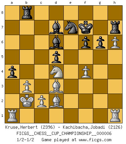 Last move : 1/2-1/2 2025 February 5 8:3:19 [Event "FICGS__CHESS__CUP_CHAMPIONSHIP__000006"] [Site "FICGS"] [Date "2024.10.06"] [Round "1"] [White "Kruse,Herbert"] [Black "Kachibacha,Jobadi"] [Result "1/2-1/2"] [WhiteElo "2396"] [BlackElo "2126"] 1.e4 c5 2.Nf3 e6 3.d4 cxd4 4.Nxd4 a6 5.h3 Bc5 6.Nc3 Ne7 7.Be3 Qc7 8.Qd2 O-O 9.O-O-O Bb4 10.Nde2 b5 11.h4 Ba5 12.Kb1 b4 13.Na4 Bb7 14.Nc5 b3 15.Nc3 bxa2+ 16.Ka1 Rd8 17.Qd6 Qxd6 18.Rxd6 Bc6 19.N5a4 Nc8 20.Rd1 d6 21.h5 h6 22.g4 Nd7 23.g5 Ndb6 24.Nxb6 Bxb6 25.Bc1 hxg5 26.Bxg5 f6 27.Bc1 Ne7 28.h6 d5 29.Rg1 g6 30.exd5 exd5 31.Bd3 Kf7 32.Rg2 Rh8 33.Rh2 Ba5 34.Bd2 Bc7 35.R2h1 Be5 36.Kxa2 Rad8 37.Kb1 Rb8 38.b3 a5 39.Ne2 a4 40.f4 Bd6 41.Kb2 Bd7 42.Nd4 Rh7 43.Ra1 Ng8 44.Rag1 Ne7 45.Ra1 Ng8 46.Rag1 Ne7 47.Ra1 1/2-1/2 Follow this game move after move (download)You know, comrade Pachman, I don't enjoy being a Minister, I would rather play Chess like you. (Che Guevara) Schach ist ein Teil der Kultur, und wenn es mit der Kultur abwärts geht, geht es auch mit dem Schach abwärts. (Mikhail Moiseyevich Botvinik) El Ajedrez te enseña a controlarl la excitación inicial que sientes cuando vez algo que parece bueno y te enseña a pensar objetivamente cuando te encuentras en problemas. (Stanley Kubrick) Que feriez-vous si vous étiez en train de jouer aux échecs et que la fin du monde arrive ? Je continuerais à jouer. (Saint Borromée) Success without honor is an unseasoned dish; it will satisfy your hunger, but it won't taste good. (Joe Paterno)