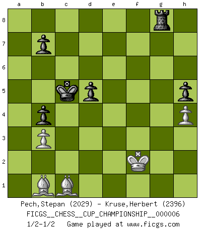Last move : 1/2-1/2 2025 January 20 4:58:43 [Event "FICGS__CHESS__CUP_CHAMPIONSHIP__000006"] [Site "FICGS"] [Date "2024.10.06"] [Round "1"] [White "Pech,Stepan"] [Black "Kruse,Herbert"] [Result "1/2-1/2"] [WhiteElo "2029"] [BlackElo "2396"] 1.e4 c5 2.Nf3 d6 3.d4 cxd4 4.Nxd4 Nf6 5.Nc3 a6 6.Be3 Ng4 7.Bg5 h6 8.Bh4 g5 9.Bg3 Bg7 10.h3 Ne5 11.Nf5 Bxf5 12.exf5 Nbc6 13.Nd5 Qa5+ 14.c3 e6 15.fxe6 fxe6 16.Ne3 Nf3+ 17.Qxf3 Bxc3+ 18.Kd1 Qa4+ 19.Nc2 Bxb2 20.Qb3 Qxb3 21.axb3 Bxa1 22.Nxa1 Ke7 23.Nc2 a5 24.Kd2 Nb4 25.Nxb4 axb4 26.Bd3 Rhc8 27.Rc1 Rc6 28.f3 Ra3 29.Bc2 Kf6 30.Kd1 d5 31.Be1 Ra2 32.g3 Ke5 33.Bd2 Kd4 34.f4 gxf4 35.gxf4 e5 36.fxe5 Ra8 37.Bb1 Kxe5 38.Ke2 Rxc1 39.Bxc1 Rg8 40.Kf2 h5 41.h4 Kd4 42.Bb2+ Kc5 43.Bc1 Kd4 44.Bb2+ Kc5 45.Bc1 1/2-1/2 Follow this game move after move (download)The isolated Pawn casts gloom over the entire chessboard. (Aaron Nimzovich) Spielt Blackmar-Diemer-Gambit, und das Matt kommt von selbst! (Emil Joseph Diemer) Me gusta decir que Bobby Fischer fue el mejor jugador que jamás haya existido. Pero lo que hizo de Fischer un genio, fue su habilidad de mezclar una frescura y pragmatismo Americano con ideas Rusas acerca de la estrategia. (Bruce Pandolfini) Les écrivains ont utilisé les échecs pour analyser les côtés extrêmes de la nature humaine. Dans ce cadre, les échecs offrent un champ d'expérimentation idéal. Mais on pourrait faire la même chose avec la peinture. Et là, en vous référant à Van Gogh, vous ne tirerez pas de conclusion définitive sur les peintres. (Gary Kasparov) Life is painting a picture, not doing a sum. (Oliver Wendell Holmes, Jr.)