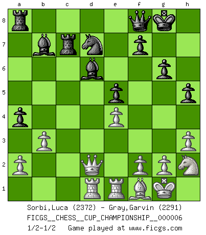 Last move : 1/2-1/2 2024 December 5 15:48:26 [Event "FICGS__CHESS__CUP_CHAMPIONSHIP__000006"] [Site "FICGS"] [Date "2024.10.06"] [Round "1"] [White "Sorbi,Luca"] [Black "Gray,Garvin"] [Result "1/2-1/2"] [WhiteElo "2372"] [BlackElo "2291"] 1.e4 e5 2.Nf3 Nc6 3.Bb5 a6 4.Ba4 Nf6 5.O-O Be7 6.Re1 b5 7.Bb3 d6 8.c3 O-O 9.h3 Bb7 10.d4 Re8 11.Nbd2 Bf8 12.Bc2 g6 13.d5 Nb8 14.c4 c6 15.b3 Qc7 16.Nf1 Rc8 17.Bg5 Nbd7 18.Rc1 a5 19.N3h2 h5 20.Nd2 Ba6 21.Bd3 bxc4 22.Nxc4 Qd8 23.dxc6 Rxc6 24.Qd2 Be7 25.Rcd1 Rc7 26.Bf1 a4 27.Bxf6 Bxf6 28.Qxd6 Be7 29.Qd5 Bb7 30.Qd2 Qf8 31.Nd6 Bxd6 1/2-1/2 Follow this game move after move (download)Chess demands total concentration. (Bobby Fischer) Offener Brief an US-Präsident Bush anlässlich der Verhaftung Bobby Fishers: Verhaften Sie mich. Stecken Sie mich in dieselbe Zelle wie Bobby Fisher und geben Sie uns ein Schachspiel mit. (Boris Vassilievich Spassky) Mis oponentes también hacen buenas movidas. A veces yo no tomo esas cosas en consideración. (Bobby Fischer) Pour se monter efficace, un Cavalier a besoin d'avant-postes ! Les Cavaliers font les meilleurs bloqueurs de pions passés. It's unlucky to be superstitious. (Dave Enteles)