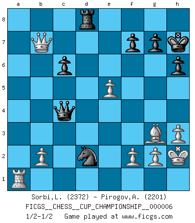 Last move : 1/2-1/2 2024 November 17 20:16:41 [Event "FICGS__CHESS__CUP_CHAMPIONSHIP__000006"] [Site "FICGS"] [Date "2024.10.06"] [Round "1"] [White "Sorbi,Luca"] [Black "Pirogov,Andrey Mikhaylovich"] [Result "1/2-1/2"] [WhiteElo "2372"] [BlackElo "2201"] 1.d4 Nf6 2.c4 e6 3.Nf3 d5 4.Nc3 c6 5.e3 Nbd7 6.Qc2 Bd6 7.Bd3 O-O 8.O-O dxc4 9.Bxc4 e5 10.h3 exd4 11.exd4 Nb6 12.Bb3 Re8 13.Bg5 Be6 14.Bh4 h6 15.Rad1 Bxb3 16.Qxb3 Be7 17.Rde1 Qc7 18.Re2 Nbd7 19.Bg3 Qb6 20.Qc2 Rad8 21.Rd1 Bb4 22.Ne5 Qa5 23.Qb3 Nxe5 24.dxe5 Bxc3 25.Rxd8 Qxd8 26.Qxc3 Qd5 27.Qe1 Qe6 28.Qb4 Qxa2 29.Qxb7 Qc4 30.Re1 a5 31.Ra1 Ne4 32.Rxa5 Rd8 33.Kh2 Kh7 34.Ra7 Nd2 35.Ra1 1/2-1/2 Follow this game move after move (download)Pawns: they are the soul of this game, they alone form the attack and defense. (Philidor) Stil? Ich habe keinen Stil! (Anatoly Karpov) El Ajedrez, como cualquier actividad creativa, solo puede existir a través del esfuerzo combinado de aquellos que tienen talento creativo y de aquellos que poseen la habilidad de organizar su trabajo creativo. (Mikhail Botvinnik) Seul un grand joueur sait à quel point il joue faiblement. (Xavier Tartacover) No enterprise is more likely to succeed than one concealed from the enemy until it is ripe for execution. (Niccolo Machiavelli)