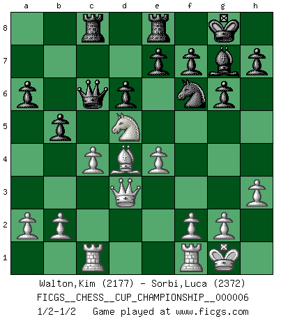 Last move : 1/2-1/2 2024 November 5 10:26:34 [Event "FICGS__CHESS__CUP_CHAMPIONSHIP__000006"] [Site "FICGS"] [Date "2024.10.06"] [Round "1"] [White "Walton,Kim"] [Black "Sorbi,Luca"] [Result "1/2-1/2"] [WhiteElo "2177"] [BlackElo "2372"] 1.e4 c5 2.Nf3 d6 3.Bb5+ Bd7 4.c4 Nc6 5.d4 cxd4 6.Nxd4 Nf6 7.Nc3 g6 8.h3 Nxd4 9.Bxd7+ Qxd7 10.Qxd4 Bg7 11.Be3 O-O 12.Qd3 Qc6 13.Bd4 a6 14.Nd5 Rfe8 15.O-O Rac8 16.Rac1 b5 17.Nb6 Rb8 18.Nd5 Rbc8 19.Nb6 Rb8 20.Nd5 Rbc8 1/2-1/2 Follow this game move after move (download)Personally, I rather look forward to a computer program winning the world Chess Championship. Humanity needs a lesson in humility. (Richard Dawkings) Der Partner hat auch seine Existenzberechtigung. (Savielly Grigorievitsch Tartakower) De eso se trata el Ajedrez. Un día le das una lección a tu oponente y al día siguiente el te da una a tí. (Bobby Fischer) Ne tendez aucun piège pour le plaisir ! Ne jouez rien dans l'espoir que l'adversaire réagisse de façon stupide ! Prenez toujours pour acquis que l'adversaire va trouver le meilleur coup ! Ne jouez jamais de coup dans l'espoir que l'adversaire ne voie pas la menace ! Chacun de vos coups doit améliorer la position d'une façon ou d'une autre. I've never seen so many men wasted so badly. (Blondie in The Good, The Bad and The Ugly)