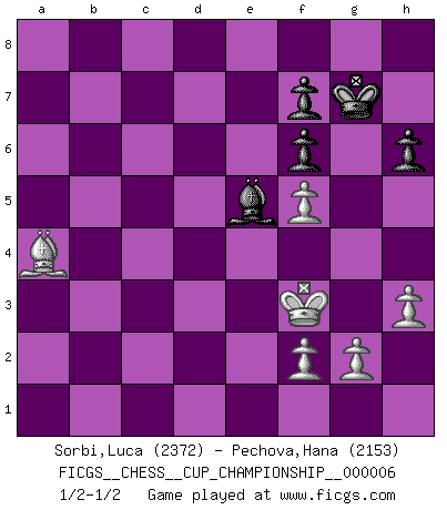 Last move : 1/2-1/2 2024 December 29 15:53:29 [Event "FICGS__CHESS__CUP_CHAMPIONSHIP__000006"] [Site "FICGS"] [Date "2024.10.06"] [Round "1"] [White "Sorbi,Luca"] [Black "Pechova,Hana"] [Result "1/2-1/2"] [WhiteElo "2372"] [BlackElo "2153"] 1.d4 d5 2.c4 e6 3.Nc3 Nf6 4.Nf3 c6 5.e3 Nbd7 6.Qc2 Bd6 7.Bd3 dxc4 8.Bxc4 O-O 9.O-O a6 10.e4 e5 11.Rd1 Qc7 12.h3 b5 13.Bb3 Bb7 14.dxe5 Nxe5 15.Nd4 Rfd8 16.Bg5 c5 17.Bxf6 gxf6 18.Nf5 c4 19.Qc1 Bf8 20.Bc2 Rxd1+ 21.Qxd1 Rd8 22.Qe2 Ng6 23.Rd1 Rxd1+ 24.Qxd1 Bc8 25.Nd5 Qe5 26.Qd4 Kh8 27.Kf1 Nf4 28.Nxf4 Bxf5 29.Qd8 Qd6 30.Qxd6 Bxd6 31.exf5 Bxf4 32.Be4 Be5 33.b3 cxb3 34.axb3 Kg7 35.Bb7 a5 36.Bc6 a4 37.bxa4 bxa4 38.Bxa4 Bf4 39.Ke2 Bd6 40.Bd1 h6 41.Ba4 Be5 42.Kf3 1/2-1/2 Follow this game move after move (download)Different people feel differently about resigning. (Bobby Fischer) Um sich vor der Gefahr einer Erkältung zu schützen, sorge der wanderlustige König beizeiten für ein brauchbares Versteck. (Aaron Nimzowitsch) Peones: ellos son el alma de esta partida, solos forman el ataque y la defensa. (Philidor) Le système Elo représente seulement une moyenne. Il est simplement un indicateur de votre stabilité. (Anatoli Karpov) Better than a thousand days of diligent study is one day with a great teacher. (Japanese proverb)