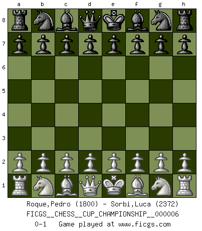 Last move : 0-1 2024 November 5 3:40:39 [Event "FICGS__CHESS__CUP_CHAMPIONSHIP__000006"] [Site "FICGS"] [Date "2024.10.06"] [Round "1"] [White "Roque,Pedro"] [Black "Sorbi,Luca"] [Result "0-1"] [WhiteElo "1800"] [BlackElo "2372"] 0-1 This chess game has been lost on time (started : 2024.10.06 0:3:28) Follow this game move after move (download)Spassky will not be psyched out by Fischer. (Mike Goodall) Wenn ich Weiß habe gewinne ich weil ich Weiß habe, wenn ich Schwarz habe gewinne ich weil ich Bogoljubov bin. (Efim Bogoljubov) Si el ingenio solamente fuese necesario para lucirse, las mujeres serían las mejores jugadoras de Ajedrez del mundo. (Albin) On entre au jeu d'Echecs comme on entre en Religion. Pour le joueur d'Echecs, la partie d'Echecs c'est l'office, la messe, le défilé du 1er Mai, le dépôt de gerbe au Monument aux Morts. C'est un drame sacré. (Michel Roos) Memory is a complicated thing, a relative to truth, but not its twin. (Barbara Kingsolver, Animal Dreams)
