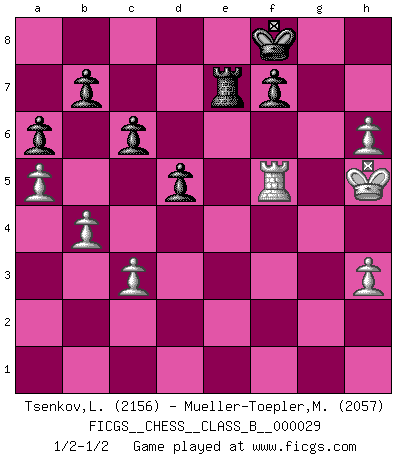 Last move : 1/2-1/2 2007 October 5 18:47:23 [Event "FICGS__CHESS__CLASS_B__000029"] [Site "FICGS"] [Date "2007.09.20"] [Round "1"] [White "Tsenkov,Ljubomir"] [Black "Mueller-Toepler,Michael"] [Result "1/2-1/2"] [WhiteElo "2156"] [BlackElo "2057"] 1.e4 e5 2.Nf3 Nf6 3.Nxe5 d6 4.Nf3 Nxe4 5.d4 d5 6.Bd3 Nc6 7.O-O Be7 8.Nbd2 Nxd2 9.Bxd2 Bg4 10.c3 O-O 11.Bf4 Bd6 12.Bxd6 Qxd6 13.Re1 Qf6 14.h3 Bh5 15.Qe2 h6 16.Qe3 Bxf3 17.Qxf3 Qxf3 18.gxf3 Rfe8 19.Re3 Kf8 20.Rae1 Ne7 21.Kg2 a6 22.a4 Ng8 23.f4 Re7 24.Re5 Rae8 25.R1e3 Nf6 26.a5 c6 27.Bf5 Rc7 28.b4 g6 29.Bd3 Rce7 30.f5 g5 31.f4 Nh5 32.fxg5 Nf4+ 33.Kf3 Rxe5 34.dxe5 Nxd3 35.Rxd3 Rxe5 36.gxh6 Rxf5+ 37.Kg4 Rf6 38.Kg5 Re6 39.Rf3 Re5+ 40.Rf5 Re7 41.Kh5 1/2-1/2 Petrov : Classical attack Kingside Castling by player White (move 7) Kingside Castling by player Black (move 10) This chess game ended in a draw. Follow this game move after move (download)You need not play well - just help your opponent to play badly. (Genrikh Chepukaitis) Ich hatte meine größten Erfolge, als ich 47 Jahre alt war. Kasparow war noch nicht mal 42 und hat das Schach schon im Stich gelassen. (Viktor Kortschnoi) Cuando no sepas que mover, espera por una idea que se le venga a la la cabeza de tu oponente. Tenlo por seguro de que esa idea estará incorrecta. (Siegbert Tarrasch) Les sacrifices démontrent seulement que quelqu'un a gaffé. (Savielly Tartacover) The human is the only animal species whose members are able to talk themselves into difficulties that would not otherwise exist. (Wendell Johnson)