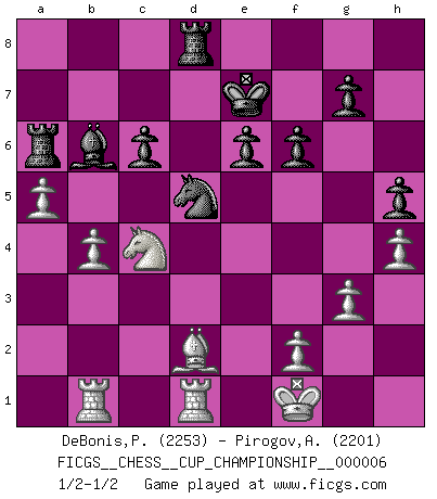 Last move : 1/2-1/2 2025 January 1 21:38:48 [Event "FICGS__CHESS__CUP_CHAMPIONSHIP__000006"] [Site "FICGS"] [Date "2024.10.06"] [Round "1"] [White "DeBonis,Patrick"] [Black "Pirogov,Andrey Mikhaylovich"] [Result "1/2-1/2"] [WhiteElo "2253"] [BlackElo "2201"] 1.e4 c5 2.Nf3 Nc6 3.Bb5 e6 4.O-O Nge7 5.Re1 a6 6.Bf1 d5 7.exd5 Nxd5 8.d4 cxd4 9.Nxd4 Ndb4 10.Nxc6 Qxd1 11.Rxd1 bxc6 12.Na3 a5 13.Bd2 Ba6 14.Bxa6 Rxa6 15.Rab1 Nd5 16.Nc4 Bb4 17.a4 f6 18.h4 Ke7 19.Kf1 h5 20.g3 Rd8 21.c3 Bc5 22.b4 axb4 23.cxb4 Bb6 24.a5 1/2-1/2 Follow this game move after move (download)Everything is in a state of flux, and this includes the world of Chess. (Mikhail Botvinnik) Ich verstehe mehr vom Schach als irgendein anderer lebender Meister. (José Raúl Capablanca) Mis oponentes también hacen buenas movidas. A veces yo no tomo esas cosas en consideración. (Bobby Fischer) A ce moment-là, je menaçais de comprendre la position ! (Clément L'Heureux) All war is based on deception. (Sun Tzu)
