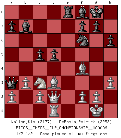Last move : 1/2-1/2 2024 December 6 3:1:47 [Event "FICGS__CHESS__CUP_CHAMPIONSHIP__000006"] [Site "FICGS"] [Date "2024.10.06"] [Round "1"] [White "Walton,Kim"] [Black "DeBonis,Patrick"] [Result "1/2-1/2"] [WhiteElo "2177"] [BlackElo "2253"] 1.e4 e5 2.Nf3 Nc6 3.Nc3 Nf6 4.d4 exd4 5.Nxd4 Bb4 6.Nxc6 bxc6 7.Bd3 d5 8.exd5 O-O 9.O-O cxd5 10.h3 c6 11.Qf3 Re8 12.Bf4 Bf8 13.Rfe1 Rxe1+ 14.Rxe1 h6 15.Rd1 Bb7 16.b3 Qe7 17.Qe3 Qb4 18.Qd2 Qa3 19.Ne2 c5 20.Nc3 Re8 1/2-1/2 Follow this game move after move (download)Chess is a fairy tale of 1001 blunders. (Savielly Tartakower) Gegen einen Schachcomputer zu verlieren ist wie Löcher in den Strümpfen zuhaben. Es ist nicht peinlich, solange man der einzige ist der es weiß. (Anonymous) Diferente gente reacciona diferentemente en aceptar la derrota. (Bobby Fischer) Mais n'est-ce pas déjà le limiter injurieusement que d'appeler les échecs un jeu? N'est-ce pas aussi une science, un art, ou quelque chose qui, comme le cercueil de Mahomet entre ciel et terre, est suspendu entre l'un et l'autre, et qui réunit un nombre incroyable de contraires ? (Stefan Zweig) Computers make it easier to do a lot of things, but most of the things they make it easier to do don't need to be done. (Andy Rooney)