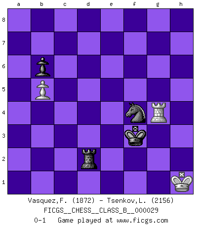 Last move : 0-1 2007 December 18 2:45:55 [Event "FICGS__CHESS__CLASS_B__000029"] [Site "FICGS"] [Date "2007.09.20"] [Round "1"] [White "Vasquez,Fernando"] [Black "Tsenkov,Ljubomir"] [Result "0-1"] [WhiteElo "1872"] [BlackElo "2156"] 1.e4 c5 2.d4 cxd4 3.c3 dxc3 4.Nxc3 Nc6 5.Nf3 e6 6.Bc4 Bb4 7.O-O Nge7 8.Nb5 d5 9.Ng5 h6 10.exd5 exd5 11.a3 Ba5 12.Nxf7 Kxf7 13.Qf3+ Kg8 14.Ba2 Be6 15.b4 Bb6 16.Re1 Qd7 17.Be3 h5 18.Bxb6 axb6 19.Qe3 Rh6 20.Qxb6 Rg6 21.Qc5 Bh3 22.g3 Kh7 23.Rad1 Bg4 24.Bb1 Bxd1 25.Rxd1 Ne5 26.Bxg6+ N5xg6 27.Qc4 Ne5 28.Qe2 Qg4 29.Qxg4 Nxg4 30.f3 Ne3 31.Re1 d4 32.Kf2 N7f5 33.Nxd4 Rxa3 34.Nxf5 Nxf5 35.Re5 Kg6 36.g4 Ra2+ 37.Kf1 hxg4 38.fxg4 Nd4 39.Rd5 Nc2 40.Rb5 Ne3+ 41.Kg1 b6 42.h3 Rd2 43.Re5 Rg2+ 44.Kh1 Rg3 45.Rh5 Kf6 46.Kh2 Rg2+ 47.Kh1 Rd2 48.b5 g6 49.g5+ Kf5 50.Rh4 Ng2 51.Rc4 Nf4 52.Rb4 Nxh3 53.Rb3 Nxg5 54.Kg1 Ne6 55.Rf3+ Ke4 56.Rf1 Nf4 57.Kh1 g5 58.Rg1 g4 59.Rxg4 Kf3 0-1 Sicilian : Smith-Morra gambit Kingside Castling by player White (move 7) 10 pieces endgame at move 38 : White KRPPP , Black KRNPP WHITE : King + 1 Rook 3 Pawns BLACK : King + 1 Rook 1 Knight 2 Pawns 9 pieces endgame at move 52 : White KRPP , Black KRNPP WHITE : King + 1 Rook 2 Pawns BLACK : King + 1 Rook 1 Knight 2 Pawns 8 pieces endgame at move 53 : White KRP , Black KRNPP WHITE : King + 1 Rook 1 Pawn BLACK : King + 1 Rook 1 Knight 2 Pawns 7 pieces endgame at move 59 : White KRP , Black KRNP WHITE : King + 1 Rook 1 Pawn BLACK : King + 1 Rook 1 Knight 1 Pawn Player Black won this chess game. Follow this game move after move (download)Your body has to be in top condition. Your Chess deteriorates as your body does. You can't separate body from mind. (Bobby Fischer) In der Schule lernt man nichts. Es ist nur Zeitverschwendung. (Robert James Fischer) Un mal plan es mejor que no tener ningún plan. (Frank Marshall) On n'a jamais que l'âge auquel on a commence à jouer aux échecs car après on cesse de vieillir. (Capablanca) You must do what you feel is right... of course. (Obi-Wan Kenobi in Star Wars ep.4)