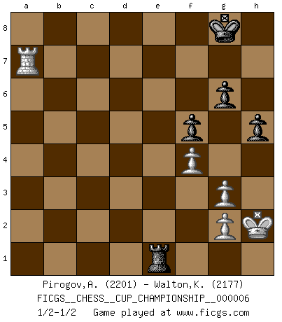 Last move : 1/2-1/2 2024 December 21 13:30:25 [Event "FICGS__CHESS__CUP_CHAMPIONSHIP__000006"] [Site "FICGS"] [Date "2024.10.06"] [Round "1"] [White "Pirogov,Andrey Mikhaylovich"] [Black "Walton,Kim"] [Result "1/2-1/2"] [WhiteElo "2201"] [BlackElo "2177"] 1.e4 e5 2.Nf3 Nc6 3.Bb5 Nf6 4.d3 Bc5 5.c3 O-O 6.O-O d5 7.Nbd2 Re8 8.exd5 a6 9.Bxc6 bxc6 10.d4 exd4 11.cxd4 Bb6 12.dxc6 Qd5 13.Nb3 Qxc6 14.Bg5 Bb7 15.Rc1 Qd6 16.Bh4 Ne4 17.Bg3 Nxg3 18.hxg3 Bd5 19.Nbd2 Qb4 20.b3 Rad8 21.Re1 Rxe1+ 22.Qxe1 a5 23.Qe3 a4 24.Qg5 c6 25.Qe3 axb3 26.axb3 Bxf3 27.Nxf3 Bxd4 28.Nxd4 Qxd4 29.Qxd4 Rxd4 30.Rxc6 Rd1+ 31.Kh2 h5 32.Rc4 Rb1 33.b4 f5 34.f3 g6 35.Rc7 Rxb4 36.f4 Rb1 37.Ra7 Re1 38.Rb7 Kf8 39.Ra7 Kg8 40.Rb7 Kf8 41.Ra7 Kg8 1/2-1/2 Follow this game move after move (download)Chess is thirty to forty percent psychology. You don't have this when you play a computer. I can't confuse it. (Judith Polgar) Ich hatte Angst gegen einen russischen Großmeister zu verlieren, und er befürchtete gegen einen kleinen Jungen zu verlieren. (über ein Remis gegen Juri Awerbach). (Robert James Fischer) Debió haber existido una vez en que los hombres eran semidióses, de otra manera no hubiesen podido inventar el Ajedrez. (Gustav Schenk) Le pion, dans sa simplicité, marche droit devant lui, mais lorsqu'il prend, il le fait obliquement? Ainsi l'homme, tant qu'il reste pauvre, marche dans la droiture et vit honnêtement, mais lorsqu'il recherche les honneurs, il flatte, se parjure et, par les voies obliques, cherche une position supérieure sur l'échiquier du monde. (Jean de Galles) Men should grow up. - Yeah. And dogs should stop licking themselves. It's not gonna happen. (Gregory House to Dr. Cameron, House M.D.)