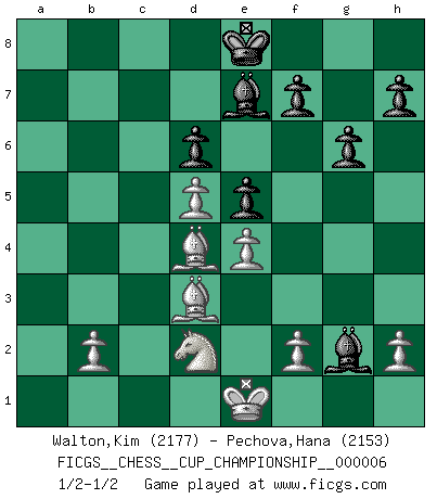 Last move : 1/2-1/2 2025 January 3 1:21:10 [Event "FICGS__CHESS__CUP_CHAMPIONSHIP__000006"] [Site "FICGS"] [Date "2024.10.06"] [Round "1"] [White "Walton,Kim"] [Black "Pechova,Hana"] [Result "1/2-1/2"] [WhiteElo "2177"] [BlackElo "2153"] 1.e4 c5 2.Nf3 Nc6 3.Bb5 d6 4.O-O Bd7 5.Re1 Nf6 6.c3 a6 7.Bf1 Bg4 8.d4 cxd4 9.cxd4 e5 10.d5 Nd4 11.Be3 Nxf3+ 12.gxf3 Bd7 13.Nd2 b5 14.a4 Be7 15.axb5 axb5 16.Rxa8 Qxa8 17.Qa1 O-O 18.Rc1 Qb7 19.Qa7 Qxa7 20.Bxa7 Ra8 21.Rc7 Kf8 22.Rb7 Bc8 23.Rb8 Rxb8 24.Bxb8 Bd7 25.Nb1 b4 26.Bc7 Ba4 27.Ba5 Bd1 28.Nd2 Nh5 29.Bxb4 Nf4 30.Bb5 Ne2+ 31.Kg2 g6 32.Kf1 Nd4 33.Ke1 Bxf3 34.Bd3 Bg2 35.Bc3 Ke8 36.Bxd4 1/2-1/2 Follow this game move after move (download)Some part of a mistake is always correct. (Savielly Tartakover) Schon mancher Spieler hat aufgegeben, um zu vermeiden, daß er eine Figur verliert. (Savielly Grigorievitsch Tartakower) En el Ajedrez, tal como en la vida, las bendiciones de hoy pueden ser el veneno del mañana. (Assaic) Les échecs sont plus proches de l'art de l'assassinat que de l'art de la guerre. (Arturo Perez-Reverte) The meaning of life is that it is to be lived, and it is not to be traded and conceptualized and squeezed into a pattern of systems. (Bruce Lee)