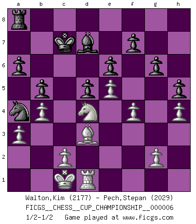 Last move : 1/2-1/2 2025 January 17 0:5:5 [Event "FICGS__CHESS__CUP_CHAMPIONSHIP__000006"] [Site "FICGS"] [Date "2024.10.06"] [Round "1"] [White "Walton,Kim"] [Black "Pech,Stepan"] [Result "1/2-1/2"] [WhiteElo "2177"] [BlackElo "2029"] 1.e4 e6 2.d4 d5 3.Nc3 Nf6 4.e5 Nfd7 5.f4 c5 6.Nf3 Nc6 7.Be3 cxd4 8.Nxd4 Bc5 9.Qd2 a6 10.O-O-O Nxd4 11.Bxd4 Bxd4 12.Qxd4 Qb6 13.Qd2 Nc5 14.h4 Bd7 15.Qd4 O-O-O 16.Rh3 Bc6 17.Ne2 Kc7 18.Rc3 Ne4 19.Qxb6+ Kxb6 20.Rb3+ Ka7 21.Nd4 Bd7 22.Be2 g6 23.Bf3 Nc5 24.Rc3 Na4 25.Re3 h5 26.b3 Nc5 27.Rc3 Rc8 28.a3 b5 29.b4 Na4 30.Rxc8 Rxc8 31.Rd2 Kb7 32.Be2 Nc3 33.Bd3 Na2+ 34.Kb2 Nc3 35.Nb3 Na4+ 36.Kc1 Kc7 37.Rd1 Rd8 38.Nd4 Ra8 39.Be2 Kb6 40.Bd3 Kc7 41.Be2 Kb6 42.Bd3 Kc7 1/2-1/2 Follow this game move after move (download)By this measure (on the gap between Fischer & his contemporaries), I consider him the greatest world champion. (Garry Kasparov) Wer mein Gambit spielt, muß bereit sein, alle Brücken hinter sich abzubrechen. Es verändert den ganzen Menschen. Es wirkt wie ein Zauberstab und fördert verkümmerte, gute Charakter- eigenschaften wieder zu Tage. (Emil Joseph Diemer) A la fecha, Fischer esta simplemente un nivel arriba de todos los mejores jugadores de Ajedrez del mundo. (John Jacobs) Toute estimation doit être constamment réévaluée. (Jacob Estrin) Inventor: A person who makes an ingenious arrangement of wheels, levers and springs, and believes it civilization. (Ambrose Bierce, The Devil's Dictionary)
