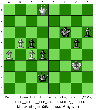 Last move : 1/2-1/2 2025 May 13 1:29:12 [Event "FICGS__CHESS__CUP_CHAMPIONSHIP__000006"] [Site "FICGS"] [Date "2024.10.06"] [Round "1"] [White "Pechova,Hana"] [Black "Kachibacha,Jobadi"] [Result "1/2-1/2"] [WhiteElo "2153"] [BlackElo "2126"] 1.Nf3 d5 2.c4 d4 3.b4 c5 4.Bb2 Nf6 5.g3 Qc7 6.Bg2 e5 7.O-O Nc6 8.b5 Ne7 9.e3 Ng6 10.d3 Be7 11.Re1 Bf5 12.Nbd2 O-O 13.a4 Rad8 14.Nf1 a5 15.e4 Bc8 16.Bc1 b6 17.Ra2 h6 18.h4 Bd6 19.N1h2 Ne7 20.h5 Kh7 21.Nxe5 Bxe5 22.f4 Nd7 23.Ng4 g5 24.hxg6+ fxg6 25.fxe5 g5 26.Nf6+ Kg7 27.Rf1 Nxf6 28.exf6+ Rxf6 29.Rxf6 Kxf6 30.Qf3+ Kg7 31.Rf2 Ng8 32.Bd2 Qe7 33.e5 Rf8 34.Qc6 Rxf2 35.Kxf2 Qe6 36.Qd5 Qg6 37.Be4 Bf5 38.Bf3 Bxd3 39.g4 Ne7 40.Qd6 Kf8 41.e6 Qf6 42.Qxb6 Be4 43.Qb8+ Kg7 44.Qg3 Qxe6 45.Bxe4 Qxe4 46.Qf3 Qe6 47.Bxa5 Ng6 48.Qb7+ Kf8 49.Bd2 Ne5 50.Qd5 Nxg4+ 51.Kg3 Qe2 52.Qd6+ Kg7 53.Qd7+ Kf6 54.Qxg4 Qxd2 55.Qf3+ Ke5 56.Qd5+ Kf6 57.Qd8+ Kf7 58.Qd7+ Kf6 59.Qd6+ Kf7 60.Qd7+ Kf6 61.Qd6+ Kf7 62.Qd7+ 1/2-1/2 Follow this game move after move (download)You may learn much more from a game you lose than from a game you win. You will have to lose hundreds of games before becoming a good player. (Jose Raul Capablanca) Ich verachte die Medien. (Robert James Fischer) El jugador de combinación piensa hacia adelante; comienza de la posición dada y trabaja las movidas contundentes en su mente. (Emanuel Lasker) Votre prénom est 'Tactique', votre deuxième prénom est 'Tactique' et votre nom est 'Tactique'. (Ken Smith) I take risks, sometimes patients die, but not taking risks causes more patients to die. So I guess my biggest problem is I've been cursed with the ability to do the math. (Gregory House, House M.D.)