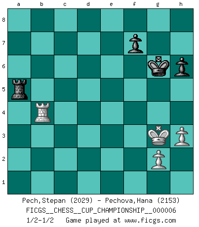 Last move : 1/2-1/2 2025 March 19 15:54:8 [Event "FICGS__CHESS__CUP_CHAMPIONSHIP__000006"] [Site "FICGS"] [Date "2024.10.06"] [Round "1"] [White "Pech,Stepan"] [Black "Pechova,Hana"] [Result "1/2-1/2"] [WhiteElo "2029"] [BlackElo "2153"] 1.d4 d5 2.c4 e6 3.Nc3 Nf6 4.Bg5 Be7 5.e3 O-O 6.Nf3 Nbd7 7.Rc1 c6 8.Bd3 dxc4 9.Bxc4 Nd5 10.Bxe7 Qxe7 11.O-O Nxc3 12.Rxc3 e5 13.dxe5 Nxe5 14.Nxe5 Qxe5 15.f4 Qe4 16.Qe2 Re8 17.Bd3 Qe7 18.e4 Bd7 19.e5 g6 20.Qf2 Kh8 21.Re1 a5 22.Bc2 Rad8 23.h3 Be6 24.Kh2 Bxa2 25.b3 a4 26.bxa4 Qb4 27.R1e3 Be6 28.f5 gxf5 29.Bxf5 Bxf5 30.Qxf5 Qe7 31.Qf4 Rd5 32.Rb3 Rxe5 33.Rxe5 Qxe5 34.Qxe5+ Rxe5 35.Rxb7 Kg7 36.Ra7 Re2 37.Kg3 Ra2 38.a5 c5 39.Ra8 c4 40.Rc8 Rxa5 41.Rxc4 h6 42.Rg4+ Kh7 43.Rf4 Kg6 44.Rb4 1/2-1/2 Follow this game move after move (download)Only sissies Castle. (Rob Sillars) Du weisst es gibt ein Problem mit Computern und Fernschach, wenn jeder eine Rating von 2450 hat. (John Christen Knudsen) Debemos de asegurarnos de que el Ajedrez no se convierta en un lenguaje muerto, muy interesante, pero tan solo para un grupo muy pequeño. (Sytze Faber) Si le désir cupide (et stupide) de gagner est une inépuisable source de souffrance, une combinaison brillante sur l'échiquier est une découverte : le coquelicot qui s'épanouit lorsque apparaît la Voie Lactée. (Arrabal) The arrogant army will lose certainly the battle. (Chinese proverb)