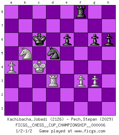 Last move : 1/2-1/2 2025 April 9 0:11:10 [Event "FICGS__CHESS__CUP_CHAMPIONSHIP__000006"] [Site "FICGS"] [Date "2024.10.06"] [Round "1"] [White "Kachibacha,Jobadi"] [Black "Pech,Stepan"] [Result "1/2-1/2"] [WhiteElo "2126"] [BlackElo "2029"] 1.e4 c6 2.d4 d5 3.Nc3 dxe4 4.Nxe4 Bf5 5.Ng3 Bg6 6.h4 h6 7.Nf3 Nd7 8.h5 Bh7 9.Bd3 Bxd3 10.Qxd3 e6 11.Bf4 Qa5+ 12.Bd2 Qc7 13.O-O-O Ngf6 14.Ne4 O-O-O 15.g3 Nxe4 16.Qxe4 Nf6 17.Qe2 Bd6 18.c4 c5 19.Bc3 cxd4 20.Nxd4 a6 21.Kb1 Rd7 22.Rc1 Kb8 23.Nb3 Qc6 24.Rh4 Rhd8 25.c5 Bc7 26.Ba5 Qb5 27.Bxc7+ Rxc7 28.Qxb5 axb5 29.Nd4 b6 30.b4 bxc5 31.Nxb5 Rb7 32.Rxc5 Nd7 33.Rd4 Rf8 34.R5c4 Ne5 35.Nd6 Rb6 36.Rc5 Nc6 37.Rf4 Rxb4+ 38.Rxb4+ Nxb4 39.a4 Nd3 40.Rc6 Ne5 41.Ra6 Kc7 42.Nb5+ Kb7 43.Rd6 Ng4 44.f3 Ne3 45.Rd3 Nd5 46.Kb2 Kc6 47.Kb3 g6 48.hxg6 fxg6 49.Kc4 Nb6+ 50.Kb4 Nd5+ 51.Kc4 Nb6+ 52.Kb4 Nd5+ 53.Kc4 1/2-1/2 Follow this game move after move (download)Chess is a part of culture and if a culture is declining then Chess too will decline. (Mikhail Botvinnik) Im Internet Chess Club betrug mein Rating vorübergehend 3350 ELO-Punkte. (Sergej Karjakin) El Peón aislado arroja penumbra sobre todo el tablero. (Aaron Nimzovich) La vie est comme un jeu d'échecs : nous esquissons un plan, mais celui-ci est tributaire de ce que daignent faire l'adversaire aux échecs et le destin dans la vie. (Arthur Schopenhauer) Man is reluctant to give credit for intelligence to anyone, except his enemies. (Albert Einstein)