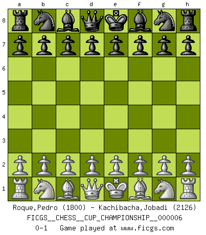 Last move : 0-1 2024 November 5 3:40:39 [Event "FICGS__CHESS__CUP_CHAMPIONSHIP__000006"] [Site "FICGS"] [Date "2024.10.06"] [Round "1"] [White "Roque,Pedro"] [Black "Kachibacha,Jobadi"] [Result "0-1"] [WhiteElo "1800"] [BlackElo "2126"] 0-1 This chess game has been lost on time (started : 2024.10.06 0:3:28) Follow this game move after move (download)Chess teaches you to control the initial excitement you feel when you see something that looks good and it trains you to think objectively when you're in trouble. (Stanley Kubrick) Ich habe die Schachforschung dermaßen betrieben, dass sie auf eine wissenschaftliche Basis gestellt wurde. (Mikhail Moiseyevich Botvinik) Tu cuerpo tiene que estar en óptima condición. Tu Ajedrez se deteriora como lo hace tu cuerpo. No puedes separar la mente y el cuerpo. (Bobby Fischer) Aidez vos pièces, elles vous aideront. (Paul Morphy) A good programmer is someone who always looks both ways before crossing a one-way street. (Doug Linder)