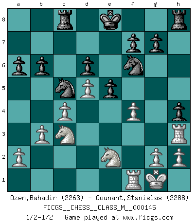 Last move : 1/2-1/2 2024 October 13 15:33:9 [Event "FICGS__CHESS__CLASS_M__000145"] [Site "FICGS"] [Date "2024.10.07"] [Round "1"] [White "Ozen,Bahadir"] [Black "Gounant,Stanislas"] [Result "1/2-1/2"] [WhiteElo "2263"] [BlackElo "2288"] 1.c4 b6 2.d4 e6 3.e4 Bb4+ 4.Bd2 Bxd2+ 5.Qxd2 d5 6.Bd3 Nc6 7.Ne2 dxe4 8.Bxe4 Bb7 9.Nbc3 Nf6 10.Bf3 Na5 11.Qf4 Qd6 12.Qxd6 cxd6 13.Bxb7 Nxb7 14.Rd1 a6 15.d5 e5 16.O-O Rc8 17.b3 h5 18.f4 h4 19.Rd3 Nc5 20.Rh3 1/2-1/2 Follow this game move after move (download)The passion for playing Chess is one of the most unaccountable in the world. (H.G. Wells) Bis zum Jahr 1971 verlief in meiner Schachkariere alles glatt. Dieses dramatische Match [Fischer-Taimanov 6:0] machte mein Leben zur Hölle. (Mark Taimanov) Solo existe una cosa que Fischer hace en el Ajedrez sin placer: ¡perder!. (Boris Spassky) On peut tirer plus d'utilité d'une partie perdue que de 100 parties gagnées. (Capablanca) Mandala - that's it! 16x16 squares as multiple of the four and the eight because of the Four Noble Truths and the Noble Eightfold Path. (Heinz-Georg Lehnhoff about Big Chess)
