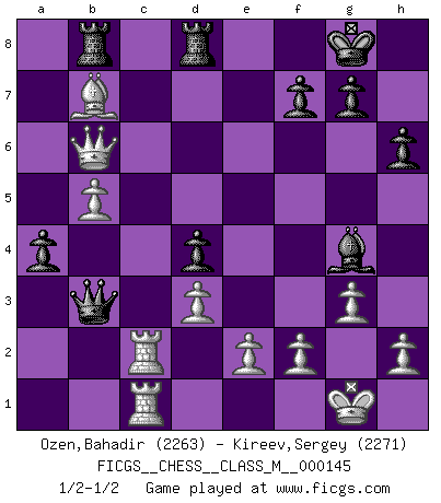 Last move : 1/2-1/2 2024 October 11 22:27:43 [Event "FICGS__CHESS__CLASS_M__000145"] [Site "FICGS"] [Date "2024.10.07"] [Round "1"] [White "Ozen,Bahadir"] [Black "Kireev,Sergey"] [Result "1/2-1/2"] [WhiteElo "2263"] [BlackElo "2271"] 1.c4 e5 2.Nc3 Nf6 3.Nf3 Nc6 4.g3 d5 5.cxd5 Nxd5 6.Bg2 Bc5 7.O-O O-O 8.d3 h6 9.Nxd5 Qxd5 10.Bd2 Rd8 11.Bc3 Qe6 12.Qc2 Qe7 13.Rac1 Bb6 14.a3 Nd4 15.Nxd4 exd4 16.Bb4 Qe8 17.a4 a5 18.Bc5 Bxc5 19.Qxc5 c6 20.Rc2 Qe6 21.b4 Qb3 22.b5 cxb5 23.axb5 Rb8 24.Qb6 Bg4 25.Rfc1 a4 26.Bxb7 1/2-1/2 Follow this game move after move (download)One bad move nullifies forty good ones. (Horowitz) Sitze auf Deine Hände. (Siegbert Tarrasch) Un jugador que es sorprendido, esta derrotado a medias. (Proverbio) Karpov est une pièce de musée. (Garry Kasparov) You can only get smarter by playing a smarter opponent. (Revolver, movie)