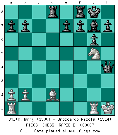 Last move : 0-1 2007 November 30 3:20:26 [Event "FICGS__CHESS__RAPID_B__000067"] [Site "FICGS"] [Date "2007.09.21"] [Round "1"] [White "Smith,Harry"] [Black "Broccardo,Nicola"] [Result "0-1"] [WhiteElo "1500"] [BlackElo "1514"] 1.e4 d6 2.d3 Nf6 3.Nf3 g6 4.g3 Bg7 5.Bg2 O-O 6.O-O Bg4 7.Nbd2 c5 8.Re1 Nc6 9.h3 Bd7 10.Nf1 Qc8 11.N1h2 Bxh3 12.Ng5 Bxg2 13.Kxg2 Ne5 14.Nhf3 Nc6 15.d4 cxd4 16.Nxd4 Nxd4 17.Qxd4 Qxc2 18.e5 dxe5 19.Qxe5 Qxf2+ 20.Kh1 Nh5 21.Be3 Nxg3+ 22.Qxg3 Qxg3 23.Bd2 Rad8 24.Rg1 Qh4+ 0-1 King's pawn Opening Kingside Castling by player Black (move 5) Kingside Castling by player White (move 6) Player Black won this chess game. Follow this game move after move (download)Tactics flow from a superior position. (Bobby Fischer) Es liegt in der Natur, vernüftig zu denken und unlogisch zu handeln. (Anatole France) El Ajedrez es un invernadero donde los frutos del carácter pueden madurar mas completamente que en la vida. (Edward Morgan Foster) Un millionnaire : 'Monsieur Steinitz ! Vous ne participez aux tournois que pour l'argent, alors que moi je n'y viens que pour l'honneur.' Steinitz : 'Chacun joue pour ce qu'il n'a pas'... I've never seen so many men wasted so badly. (Blondie in The Good, The Bad and The Ugly)