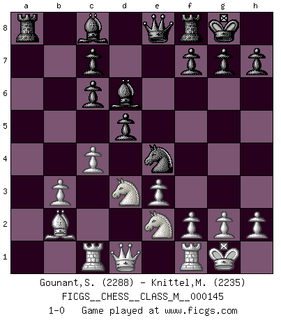 Last move : 1-0 2025 January 14 14:23:47 [Event "FICGS__CHESS__CLASS_M__000145"] [Site "FICGS"] [Date "2024.10.07"] [Round "1"] [White "Gounant,Stanislas"] [Black "Knittel,Martin"] [Result "1-0"] [WhiteElo "2288"] [BlackElo "2235"] 1.b3 e5 2.Bb2 Nc6 3.e3 Nf6 4.Bb5 Bd6 5.Na3 e4 6.Nc4 Be7 7.Bxc6 bxc6 8.Ne2 O-O 9.O-O a5 10.d3 a4 11.Rc1 d5 12.Ne5 Qe8 13.dxe4 Nxe4 14.c4 axb3 15.axb3 Bd6 16.Nd3 1-0 This chess game has been lost on time (started : 2024.10.07 1:30:25) Follow this game move after move (download)Via the squares on the chessboard, the Indians explain the movement of time and the age, the higher influences which control the world and the ties which link Chess with the human soul. (Al-Masudi) Ich hatte Zahnschmerzen im ersten Spiel. In der zweiten Partie tat mir der Kopf weh. In der dritten war es eine Rheuma-Attacke und während der vierten fühlte ich mich nicht gut. Und in der fünften? Nun, man muss doch nicht jedes Spiel gewinnen, oder? (Savielly Grigorievitsch Tartakower) El Ajedrez es un expediente tonto que hace creer a la gente inactiva que hacen una cosa muy astuta cuando solamente estan perdiendo su tiempo. (George Bernard Shaw) Donnez-moi un Cavalier en 6e et je gagnerais toutes mes parties. (Steinitz) A specialist learns more and more about less and less until he knows everything about nothing. (Nicholas Murray Butler)