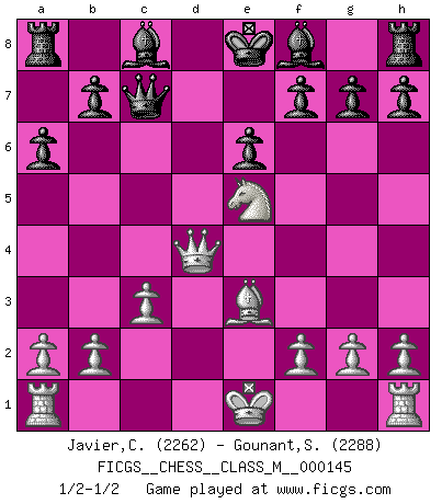 Last move : 1/2-1/2 2024 November 3 21:19:35 [Event "FICGS__CHESS__CLASS_M__000145"] [Site "FICGS"] [Date "2024.10.07"] [Round "1"] [White "Javier,Christian"] [Black "Gounant,Stanislas"] [Result "1/2-1/2"] [WhiteElo "2262"] [BlackElo "2288"] 1.e4 e6 2.d4 d5 3.Nc3 dxe4 4.Nxe4 Nd7 5.Nf3 Ngf6 6.Nxf6+ Nxf6 7.c3 c5 8.Be3 Qc7 9.Ne5 a6 10.Qa4+ Nd7 11.Bb5 cxd4 12.Bxd7+ Bxd7 13.Qxd4 Bc8 14.Nc4 Bd7 15.Ne5 Bc8 1/2-1/2 Follow this game move after move (download)Chess is above all, a fight ! (Emanuel Lasker) Das Schach ist nichts für kleine Geister, es beansprucht einen vollen Mann, der sich nicht sklavisch an das Überlieferte hält, sondern selbständig die Tiefen des Spiels zu ergründen sucht. (Wilhelm Steinitz) Realmente no sabemos como el juego fue inventado, aunque hay sospechas. Tan pronto como descubramos a los culpables, se los haremos saber. (Bruce Pandolfini) Les Echecs ont trois composantes : le temps, l'espace et le matériel en dernier. (Mikhail Tal) Fear is the path to the dark side. Fear leads to anger; anger leads to hate; hate leads to suffering. I sense much fear in you. (Master Yoda in Star Wars ep.1)