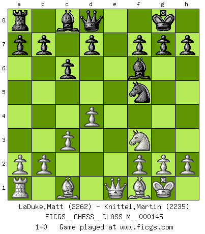 Last move : 1-0 2025 January 26 20:2:2 [Event "FICGS__CHESS__CLASS_M__000145"] [Site "FICGS"] [Date "2024.10.07"] [Round "1"] [White "LaDuke,Matt"] [Black "Knittel,Martin"] [Result "1-0"] [WhiteElo "2262"] [BlackElo "2235"] 1.e4 e5 2.Nf3 Nc6 3.Bb5 Nf6 4.O-O Nxe4 5.Re1 Nd6 6.Nxe5 Be7 7.Bf1 Nxe5 8.Rxe5 O-O 9.d4 Bf6 10.Re1 Re8 11.c3 c6 12.Nd2 Rxe1 13.Qxe1 Nf5 14.Nf3 1-0 This chess game has been lost on time (started : 2024.10.07 1:30:25) Follow this game move after move (download)All I want to do, ever, is just play Chess. (Bobby Fischer) Kritik überlasse ich den Spießern. Ich zeige nichts, wofür ich mich schämen muss. (Alexandra Kosteniuk) Cuando tengas duda... ¡juega al Ajedrez!. (Tevis) En blitz, le Cavalier l'emporte sur le Fou. (Vlastimil Hort) Success without honor is an unseasoned dish; it will satisfy your hunger, but it won't taste good. (Joe Paterno)