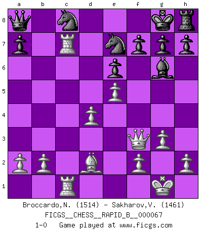 Last move : 1-0 2007 September 27 10:55:9 [Event "FICGS__CHESS__RAPID_B__000067"] [Site "FICGS"] [Date "2007.09.21"] [Round "1"] [White "Broccardo,Nicola"] [Black "Sakharov,Vitalij"] [Result "1-0"] [WhiteElo "1514"] [BlackElo "1461"] 1.c4 d5 2.cxd5 Qxd5 3.Nc3 Qa5 4.g3 c6 5.Bg2 Bf5 6.e4 Bg6 7.Nge2 e6 8.O-O Nd7 9.d4 Ngf6 10.Bd2 Qc7 11.Rc1 Bb4 12.e5 Bxc3 13.Nxc3 Ng8 14.Nb5 Qb6 15.Nd6+ Kf8 16.Nxb7 Qxb7 17.Bxc6 Qc8 18.Qa4 Nb6 19.Qa3+ Ne7 20.Bxa8 Qxa8 21.Rc7 Nbc8 22.Rfc1 Kg8 23.Qf3 1-0 English Opening Kingside Castling by player White (move 8) Player White won this chess game. Follow this game move after move (download)I like the moment when I break a man's ego. (Bobby Fischer) Zum Sieg gelangt man nicht, wenn man gut, sondern nur wenn man besser spielt (Savielly Grigorievitsch Tartakower) Si pudieramos observar el interior de la cabeza de un jugador de Ajedrez, encontraríamos ahí un mundo lleno de sentimientos, imágenes, ideas, emoción y pasión. (Alfred Binet) Le jeu d'échecs fait naître et fortifie en nous plusieurs qualités précieuses dans le cours de l'existence, telles que la prévoyance, la circonspection, la prudence, et la persévérance. (Benjamin Franklin - 1783, la morale des échecs) The good fighters of old first put themselves beyond the possibility of defeat, and then waited for an opportunity of defeating the enemy. (Sun Tzu)