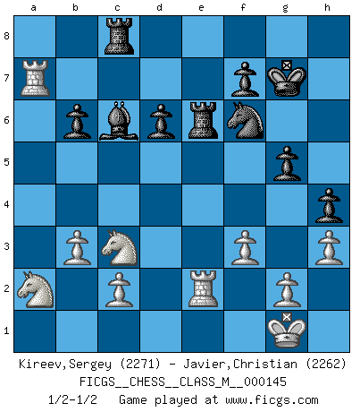 Last move : 1/2-1/2 2024 November 25 4:8:58 [Event "FICGS__CHESS__CLASS_M__000145"] [Site "FICGS"] [Date "2024.10.07"] [Round "1"] [White "Kireev,Sergey"] [Black "Javier,Christian"] [Result "1/2-1/2"] [WhiteElo "2271"] [BlackElo "2262"] 1.e4 c5 2.Nc3 Nc6 3.Nf3 g6 4.d4 cxd4 5.Nxd4 Bg7 6.Be3 Nf6 7.Bc4 O-O 8.Bb3 d5 9.exd5 Na5 10.O-O Nxb3 11.Nxb3 b6 12.d6 Qxd6 13.Qxd6 exd6 14.Rfe1 Re8 15.f3 Ba6 16.Bd4 Re6 17.a4 Rc8 18.a5 Bc4 19.Red1 h5 20.axb6 axb6 21.Nc1 h4 22.b3 Bd5 23.h3 Bc6 24.Ra6 g5 25.N1a2 Nd7 26.Bxg7 Kxg7 27.Rd2 Ne5 28.Rf2 Nd7 29.Ra7 Nf6 30.Re2 1/2-1/2 Follow this game move after move (download)I am still a victim of Chess. It has all the beauty of art and much more. It cannot be commercialized. Chess is much purer than art in its social position. (Marcel Duchamp) Smyslow ist ein Beweis dafür, dass ich noch zehn Jahre spielen kann! [der 75 jährige über den 85 jährigen] (Viktor Kortschnoi) El Ajedrez es una guerra en un tablero. El objetivo es aplastar la mente del oponente. (Bobby Fischer) Shah mat. Le roi est mort. Cri de fierté d'un joueur venant de terrasser son adversaire, courtoisement, sans effusion de sang. The Internet is the world's largest library. It's just that all the books are on the floor. (John Allen Paulos)