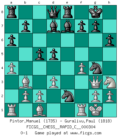 Last move : 0-1 2024 November 27 0:20:21 [Event "FICGS__CHESS__RAPID_C__000304"] [Site "FICGS"] [Date "2024.10.08"] [Round "1"] [White "Pintor,Manuel"] [Black "Guralivu,Paul"] [Result "0-1"] [WhiteElo "1735"] [BlackElo "1818"] 1.e4 c5 2.f4 d6 3.Nf3 Nc6 4.Bc4 Nf6 5.d3 a6 6.a4 Bd7 7.Nc3 e6 8.O-O Be7 9.Ng5 O-O 10.Qf3 h6 11.Nh3 d5 12.exd5 Nd4 13.Qf2 exd5 14.Bb3 Re8 15.Ne2 Ng4 16.Qg3 Nxe2+ 0-1 Follow this game move after move (download)In the perfect Chess combination as in a first-rate short story, the whole plot and counter-plot should lead up to a striking finale, the interest not being allayed until the very last moment. (Yates and Winter) Garry Kasparov war erst in der Großmeister-Organisation GMA, dann in der Profischach-Vereinigung PCA, zum Schluss kehrte er wieder in den Schoß der FIDE zurück. Aber gut, manche Leute sind flexibel (Viswanathan Anand) Muchos jugadores de Ajedrez se sorprendían cuando después de la partida, Fischer explicaba con calma: 'Yo ya había analizado esta posibilidad' en una posición en la cual yo creía que no era posible de prever desde la apertura. (Mikhail Tal) Les Echecs sont affaire de jugement sensible. Savoir quand frapper et quand esquiver. (Fischer) In theory there is no difference between theory and practice. In practice there is. (Yogi Berra)