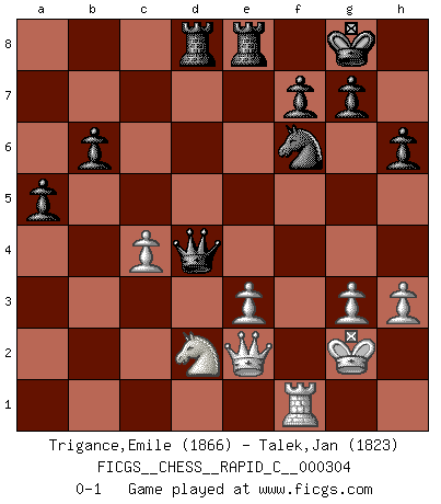 Last move : 0-1 2024 December 2 18:49:57 [Event "FICGS__CHESS__RAPID_C__000304"] [Site "FICGS"] [Date "2024.10.08"] [Round "1"] [White "Trigance,Emile"] [Black "Talek,Jan"] [Result "0-1"] [WhiteElo "1866"] [BlackElo "1823"] 1.Nf3 d5 2.c4 d4 3.b4 c5 4.g3 cxb4 5.d3 Nc6 6.a3 e5 7.Bg2 a5 8.Bd2 Bd7 9.O-O Bc5 10.Bc1 h6 11.Bb2 Nf6 12.Nfd2 Qc7 13.axb4 Nxb4 14.Nb3 Be7 15.N1d2 O-O 16.Nc1 Bc6 17.Na2 Na6 18.Nc1 Bxg2 19.Kxg2 b6 20.h3 Rfe8 21.e4 dxe3 22.fxe3 Rad8 23.Qf3 Nb4 24.Qe2 Qd7 25.d4 exd4 26.Bxd4 Nc2 27.Ncb3 Nxa1 28.Nxa1 Bc5 29.Nab3 Bxd4 30.Nxd4 Qxd4 0-1 Follow this game move after move (download)Chess is the art which expresses the science of logic. (Mikhail Botvinnik) Ich spiele ehrlich und spiele, um zu gewinnen. Wenn ich verliere nehme ich meine Medizin. (Robert James Fischer) Un Peón pasado es un criminal, quién debe ser mantenido bajo candado y llave. Leves medidas, tales como vigilancia policiaca, no son suficientes. (Aaron Nimzovich) Nous sommes les pions de la mystérieuse partie d'Echecs jouée par Dieu. Il nous déplace, nous arrête, nous pousse encore, puis nous lance un à un dans la boîte du Néant. Epitaphe sur la tombe de David Janowsky (1868-1927). If you have any trouble condescending, find a Unix user to show you how it's done. (Scott Adams)