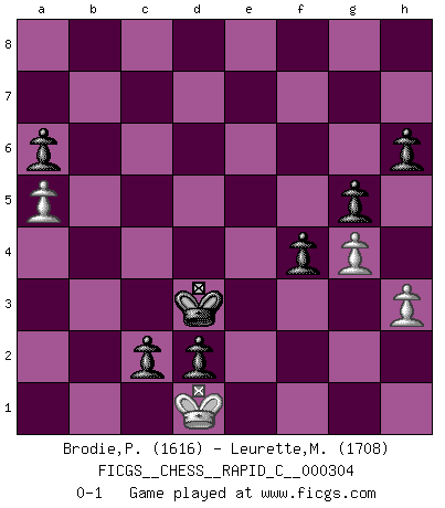 Last move : 0-1 2025 January 13 20:47:45 [Event "FICGS__CHESS__RAPID_C__000304"] [Site "FICGS"] [Date "2024.10.08"] [Round "1"] [White "Brodie,Peter"] [Black "Leurette,Marc-Antoine"] [Result "0-1"] [WhiteElo "1616"] [BlackElo "1708"] 1.e4 e5 2.Nf3 Nc6 3.Bb5 Nf6 4.Nc3 Bc5 5.h3 a6 6.Bc4 O-O 7.O-O b5 8.Bb3 d6 9.d3 h6 10.Nd5 Nxd5 11.exd5 Nd4 12.Nxd4 Bxd4 13.c3 Bb6 14.Be3 Bxe3 15.fxe3 Qg5 16.Qf3 Bb7 17.e4 Rae8 18.Qg4 Qe3+ 19.Kh2 Qxd3 20.Qf3 Qd2 21.Rf2 Qf4+ 22.Qxf4 Bc8 23.Bd1 exf4 24.Rxf4 g5 25.Rf2 Rxe4 26.Bf3 Re7 27.Re2 Rfe8 28.Rae1 Rxe2 29.Rxe2 Rxe2 30.Bxe2 f5 31.g4 f4 32.Bf3 Kf7 33.Kg2 Kf6 34.Kf2 Ke5 35.Ke2 Bb7 36.Kd3 Bxd5 37.Bxd5 Kxd5 38.b3 c5 39.c4+ Ke5 40.Ke2 Kd4 41.Kd2 bxc4 42.bxc4 Kxc4 43.Kc2 d5 44.a3 d4 45.Kd2 d3 46.Kd1 Kd4 47.Kd2 c4 48.a4 c3+ 49.Kd1 Ke3 50.Ke1 d2+ 51.Kd1 Kd3 52.a5 c2+ 0-1 Follow this game move after move (download)Though most people love to look at the games of the great attacking masters, some of the most successful players in history have been the quiet positional players. They slowly grind you down by taking away your space, tying up your pieces, and leaving you with virtually nothing to do ! (Yasser Seirawan) Sitze auf Deine Hände. (Siegbert Tarrasch) Cada Peón es una Reina en potencia. (James Mason) Comme les marins qui ont mille raisons différentes d'aller en mer, les joueurs d'échecs en ont tout autant avant de s'installer devant une table et jouer... (Vincent Bertignac, philosophe) Wisdom is the reward you get for a lifetime of listening when you'd have preferred to talk. (Doug Larson)