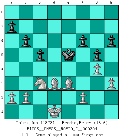 Last move : 1-0 2024 December 17 8:12:11 [Event "FICGS__CHESS__RAPID_C__000304"] [Site "FICGS"] [Date "2024.10.08"] [Round "1"] [White "Talek,Jan"] [Black "Brodie,Peter"] [Result "1-0"] [WhiteElo "1823"] [BlackElo "1616"] 1.Nh3 e5 2.c4 Bc5 3.e3 Nf6 4.d4 exd4 5.exd4 Be7 6.Nc3 O-O 7.Nf4 d6 8.h3 Bd7 9.Bd3 Nc6 10.Be3 Nb8 11.g4 h6 12.Rg1 g5 13.Nfd5 Nxd5 14.cxd5 c6 15.Qf3 f6 16.O-O-O c5 17.dxc5 dxc5 18.d6 Bxd6 19.Qd5+ Kg7 20.Qxd6 b6 21.Be4 Nc6 22.Qxd7+ Qxd7 23.Rxd7+ Rf7 24.Rxf7+ Kxf7 25.Bxc6 Rc8 26.Bb5 Rd8 27.Rd1 Rxd1+ 28.Kxd1 Ke6 29.Bc4+ Ke5 30.Bd3 1-0 Follow this game move after move (download)Dazzling combinations are for the many, shifting wood is for the few. (Georg Kieninger) Ich tröste mich mit dem Vergnügen, daß Schachfans, Zuschauer und Leser glücklich sind, wenn ein Großmeister etwas riskiert, statt nur Klötzchen zu schieben. (Mikhail Nekhemyevich Tal) Un jugador que trata de regresar una movida en el Ajedrez es un futuro carterista. (Richard Fenton) C'est une question de caractère, Beaucoup de gens perdent leur motivation très vite. D'autres, ils sont rares, peuvent la conserver très longtemps. J'aime les échecs, encore aujourd'hui je suis heureux d'analyser des parties. J'aime toujours gagner, je déteste encore perdre. Bien jouer est important pour mon intégrité intellectuelle et morale. Et puis les échecs vivent en ce moment une période historique grâce à Internet. Ils se développent dans les systèmes éducatifs à travers le monde. Ils sortent de leur ghetto, et c'est mon rôle de mener à bien cette révolution. (Gary Kasparov) A good player is always lucky. (Capablanca)